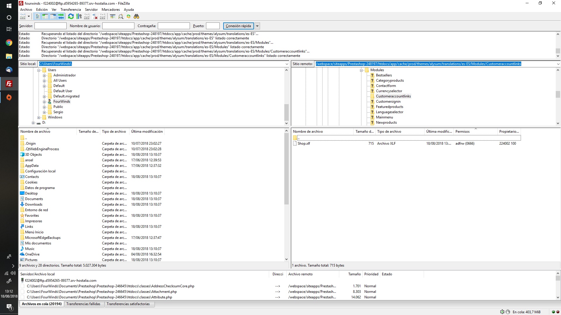 Sergio.R Posted August 19, 2018 Author Share Posted August 19, 2018 Buenas tardes, gracias a ambos por vuestra respuesta, Para más datos, tengo PS 1.7.2.2, versión Php 7.0.30, uso ftp para cambiar los permisos y listo, lo hago desde filezilla. Tengo mi Cpanel con mi hosting hostalia. He realizado los cambios, y sigue ocurriendo lo mismo. He establecido recursivamente todos los permisos, y comprobado la carpeta del error para que los permisos estuvieran en 755 y 644, y así es, en cuanto hago click en modificar las traducciones del tema, se modifican los permisos de nuevo y todos los archivos y carpetas de "cache" pasan a 777 y 666 automáticamente, y vuelve a dar el error de las capturas de pantalla. Alguna otra idea? Un saludo Link to comment Share on other sites More sharing options...