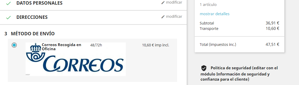 aixos Posted August 20, 2018 Share Posted August 20, 2018 (edited) Hola, estoy super intrigado con esto que te pasa. se supone que no has puesto nimgun módulo que afecte a esta sección, porque al principio hablas de códigos postales. Voy a probar esto tuyo y te cuento Bueno ya lo he probado y funciona bien , los transportes etc... Lo he hecho así , me he creado My carrier ( este para Peninsula y Baleares ) My carrier canarias ( este para Canarias ) He creado estas zonas: España proba Islas baleares proba Islas canarias proba España es Europa (Eso es así) He configurado las tarifas de el transporte de las zonas de esta manera España proba ........................ My carrier precio 5 islas baleares proba............... My Carrier precio 10 islas canarias proba............... My carrier canarias precio 100 Para probarlo entro con un usuario normal , y cambio la provincia donde vive y cambia el precio del transporte correctamente. My carrier My carrier canarias Edited August 20, 2018 by aixos (see edit history) Link to comment Share on other sites More sharing options...