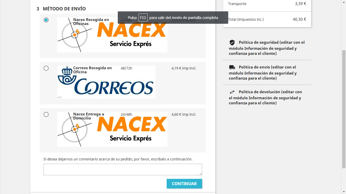 gusman126 Posted August 20, 2018 Share Posted August 20, 2018 (edited) probado tenias que haber dicho que estabas usando modulos de nacex, es posible que el modulo este limitando la provincia de canarias, comprueba si Nacex reparte a canarias y si estos modulos aceptan las provincias, direccion canarias 1 transporte mas caro : Direccion peninsula 3 transportes deberian estar los 3 transportistas en todas las zonas? tenias que haber dicho que estabas usando modulos de nacex, es posible que el modulo este limitando la provincia de canarias, comprueba si Nacex reparte a canarias y si estos modulos aceptan las provincias, es posible que sea por culpa de los modulos que bloquean las provincias de canarias Edited August 20, 2018 by gusman126 (see edit history) Link to comment Share on other sites More sharing options...