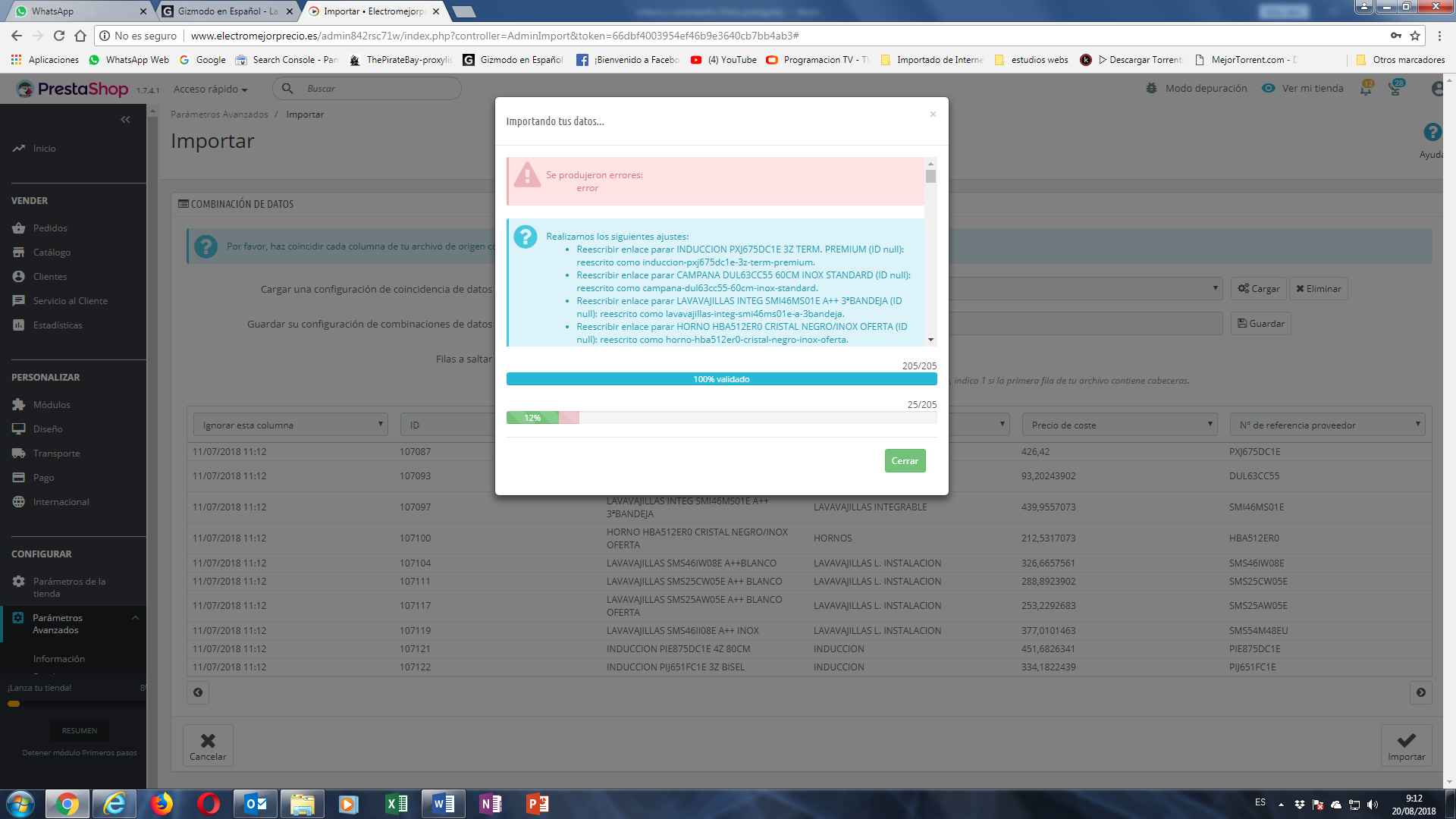 elplacerdelgourmet Posted August 20, 2018 Share Posted August 20, 2018 Hola .. que tal??. un saludo.... Otro delos miles de post dedicados a la importacion de articulos desde un csv... ahora con 1.7 , cuando ya me he peleado con este proceso con 1.6 hasta el infinito y mas alla,...... pero nada... Os cuento para ver si me podeis decir algo ... tengo un CSV de unos 5000 articulos .. los he dividido en grupos de 500, en grupos de 250.. hasta de 100...... ... los ha grabado en varios formatos UTF8 iso ,,, etc etc etc.... he mirado y remirado las lines de fichero por si tiene fallo ,,, la capacidad de las imagenes .. (ahora de 15MB), e mi servidor (STRATO), las capacidades que pueden albergar ... el PHP que tiene montado (7.0), he probado con versiones anteriores ... y cada x tiempo ya sea el fichero como sea aparece el tipico mensaje de Error . si decir a que viene ,,, Os pongo una captura a ver si alguien en su infinita bondad me puede iluminar con alguna idea o cosa que os haya pasado ..... incluso en el ejemplo que s pongo miro e articulo de la linea 25, el de la 24 y el de la 26 a ver y esta todo correcto!!!!!! De todas formas gracias,,,,, a ver si hay sueertecilla..... Link to comment Share on other sites More sharing options...