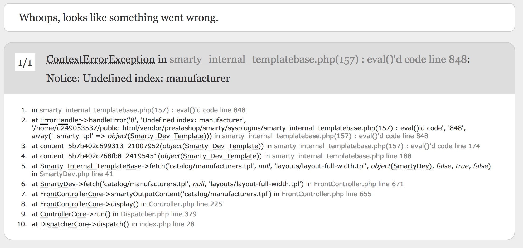 Resulta que al hacer click sobre la opción "MARCAS" de la tienda de mi amigo aparece el siguiente error (adjunto):