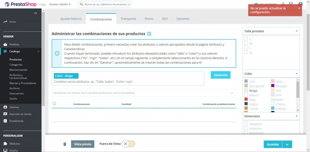 MadrizWarriors Posted August 29, 2018 Share Posted August 29, 2018 Hola a todos, hace unos días cree una página con la ultima versión de PrestaShop 1.7.4.2. Dicho esto, os comentaré cual es mi problema: al crear mis primeros atributos para mis prodcutos, talla y color, no tuve problema y me funcionó perfectamente, el problema vino, cuando quise añadir un nuevo valor al atributo color, que no me aparecia dentro del desplegable del atributo al crear una combinacion de producto, probando, borre el atributo, lo cree de nuevo, y ahora no me aparece el desplegable para crear combinacion con el color, acto seguido, hice lo mismo con las tallas, lo borre y lo cree de nuevo, es un poco fustrante ya que acabo de crear la página y no entiendo como puede fallar, apenas he tocado nada. Os adjunto una foto de como al crear producto no aparece ningun atributo para poder seleccionar. Link to comment Share on other sites More sharing options...