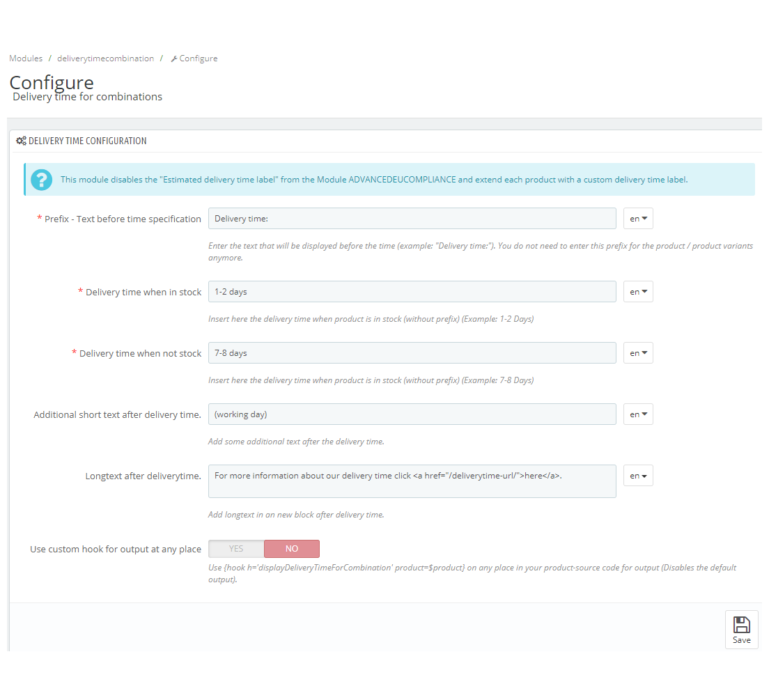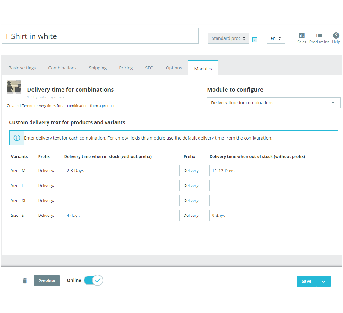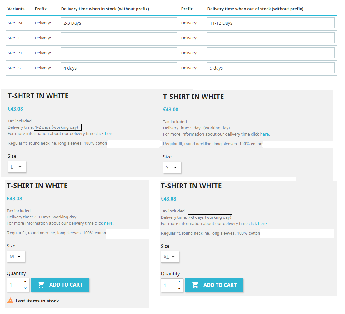 heyho Posted August 27, 2018 Share Posted August 27, 2018 (edited) Add an individual delivery time to every combination of a product. With prestashop and also the module 'ps_legalcompliance' it is not possible to have specific delivery times for combinations. Here is a module where it is possible to have different delivery times for the products and its combinations. You can also define default values. https://addons.prestashop.com/en/combinaisons-customization/40376-delivery-time-for-combinations.html Example: Shirt Size S: Delivery time 1-2 days Shirt Size L: Delivery time 3-4 days Shirt Size XXL: Delivery time 7-8 days Features Predefined standard delivery time for stored and non-stocked products. Individual delivery times for every combination of a product. Add an additional short text after the delivery time. Add an additional long text (also HTML) after the delivery time. If necessary, you can place the delivery time anywhere on the product page with a HOOK. Multilanguage. Module: https://addons.prestashop.com/en/combinaisons-customization/40376-delivery-time-for-combinations.html Demo-Video: https://www.youtube.com/watch?v=TijNvS8wPnQ Edited September 6, 2018 by heyho (see edit history) Link to comment Share on other sites More sharing options...