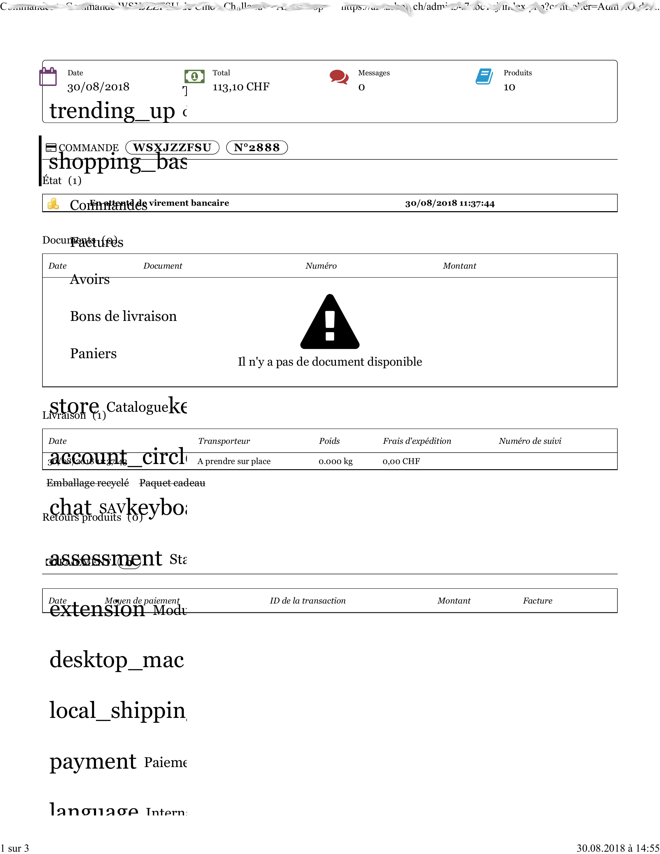 Mathrix Posted August 30, 2018 Share Posted August 30, 2018 Bonjour, je rencontre un problème d'affichage lorsque j'imprime une commande, des phrases apparaissent par dessus le bon de commande (voir pièce jointe) D'avance merci pour votre aide. ---------------------------------------------------------------------- Ma config : Version du logiciel serveur : Apache Version de PHP : 7.1.21 Limite de mémoire : 256M Temps maximal d'exécution : 60 Taille max. pour envoi de fichiers : 128MVersion de PrestaShop : 1.7.4.2 Link to comment Share on other sites More sharing options...