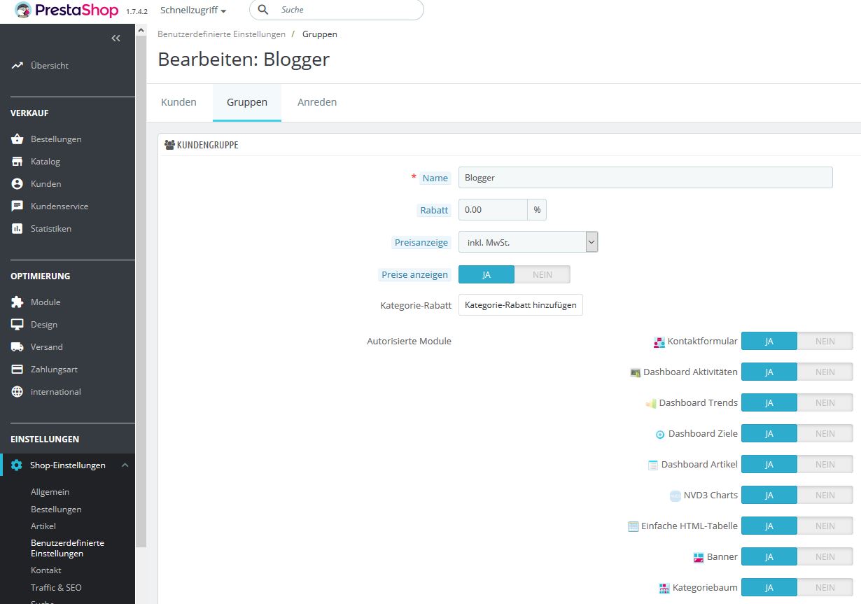 0 Hendan Posted August 31, 2018 Author Share Posted August 31, 2018 Es gibt nur folgende Option: Shop-Einstellungen -> Benutzerdefinierte Einstellungen -> Kundengruppen (siehe Foto) Doch hier würde ich lediglich das gesamte BLOG-Modul blockieren. Wir möchten ja nur einen bestimmten Teil des Moduls blockieren ^^ trotzdem danke für die idee rictools Link to comment Share on other sites More sharing options...