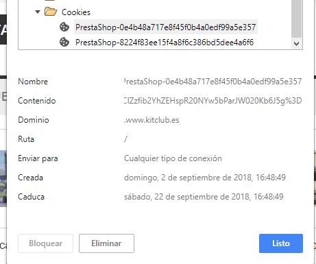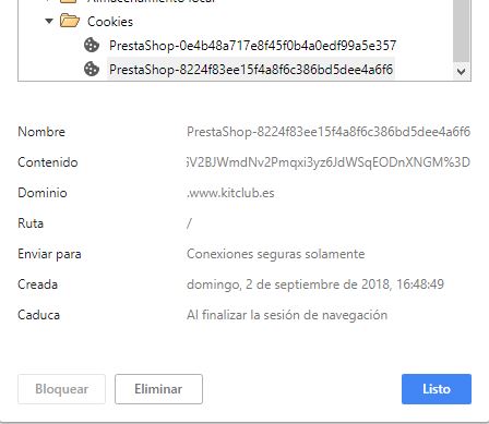 Eusebio100 Posted September 4, 2018 Author Share Posted September 4, 2018 hace 5 minutos, Knowband Plugins dijo: En cuanto a la cookie psAdmin, creo que usted había iniciado sesión en el mismo navegador desde el administrador y la interfaz. Esa es la razón por la cookie psAdmin está disponible en su navegador. Sugeriría intentar iniciar sesión en el frente a través de la ventana de incógnito y verificar nuevamente. I have checked in external browsers and it always appears. You can check that the psAdmin cookie always exists in www.kitclub.es. Now they are renamed: Maquetas-0e4b48a717e8f45f0b4a0edf99a5e357 = psAdmin-0e4b48a717e8f45f0b4a0edf99a5e357 Link to comment Share on other sites More sharing options...
