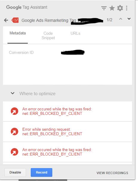 pattyo1 Posted September 4, 2018 Share Posted September 4, 2018 Hello there, im trying to install my google remarketing code but im allways getting errors like in the attached picture. I just put the code in footer.tpl above </body> and final code looks like this {literal} <!-- Kód spoločnosti Google pre remarketingovú značku --> <!-------------------------------------------------- Remarketingové značky nemôžu byť priradené k informáciám umožňujúcim identifikáciu osôb ani umiestnené na stránkach súvisiacich s citlivými kategóriami. Ďalšie informácie a pokyny k nastaveniu značky nájdete na nasledujúcich stránkach: http://google.com/ads/remarketingsetup ---------------------------------------------------> <script type="text/javascript"> /* <![CDATA[ */ var google_conversion_id = 979689030; var google_custom_params = window.google_tag_params; var google_remarketing_only = true; /* ]]> */ </script> <script type="text/javascript" src="//www.googleadservices.com/pagead/conversion.js"> </script> <noscript> <div style="display:inline;"> <img height="1" width="1" style="border-style:none;" alt="" src="//googleads.g.doubleclick.net/pagead/viewthroughconversion/979689030/?guid=ON&script=0"/> </div> </noscript> {/literal} I will be really grateful for any help. Thank you Link to comment Share on other sites More sharing options...