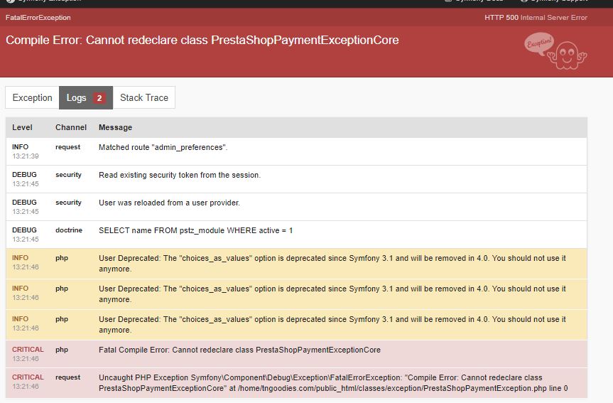 Everything went ok, i tested almost all the store , did purchases , emails received , etc  but i noticed when i go to the Shop Parameters -> General Option i got an error . I activated the debug mode , and the error that appear is this "Compile Error: Cannot redeclare class PrestaShopPaymentExceptionCore"