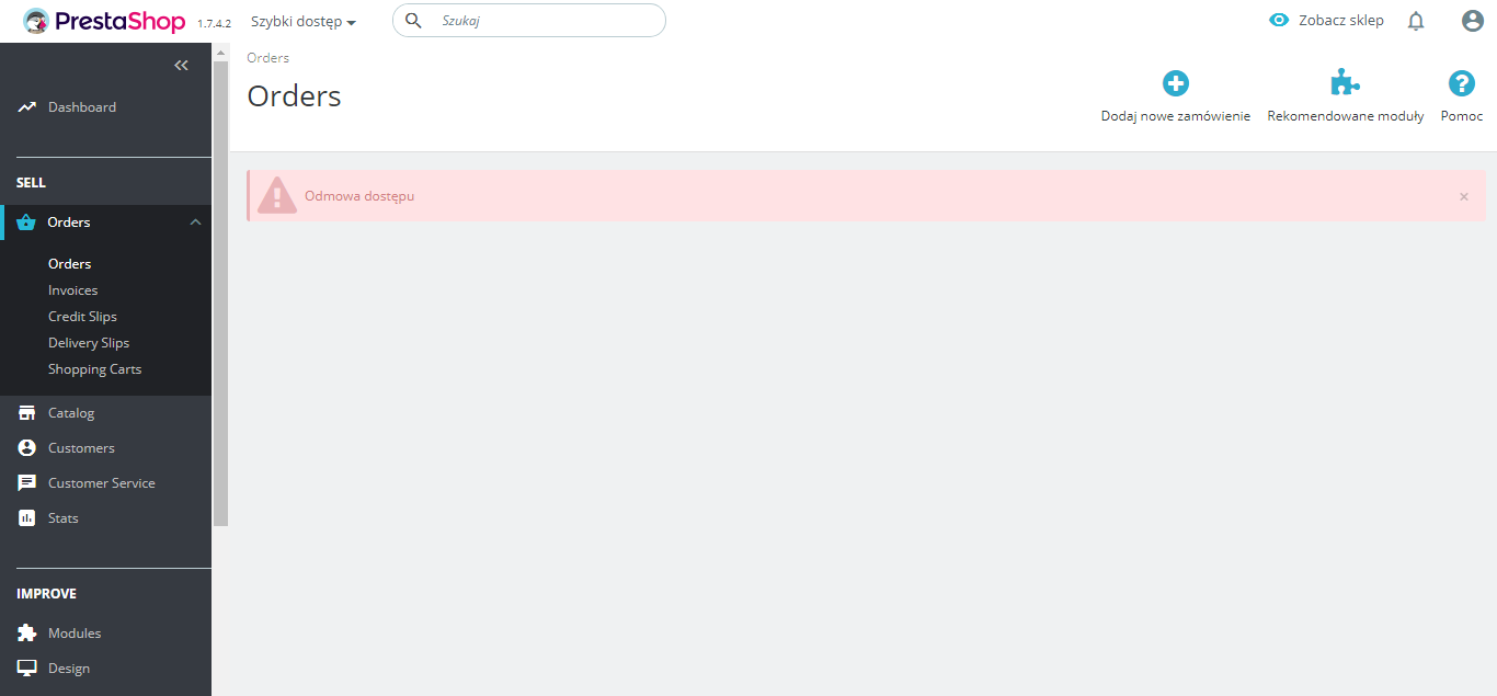 atx-serwis Posted September 7, 2018 Share Posted September 7, 2018 (edited) Witam w prescie 1.7.4.2 jest brak dostepu do zamowien (orders)., ta sama sytuacja wystepuje np przy zarzadzaniu klientami, stats, w zakladce Shipping Preferences, pozniej localization, order settings, administration przerzuca mnie na pulpit, prosze o pomoc. z gory dziekuje Edited September 10, 2018 by atx-serwis (see edit history) Link to comment Share on other sites More sharing options...