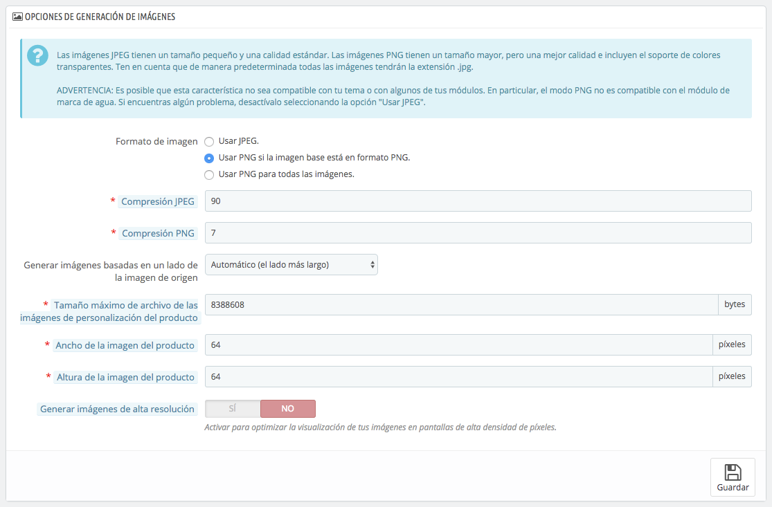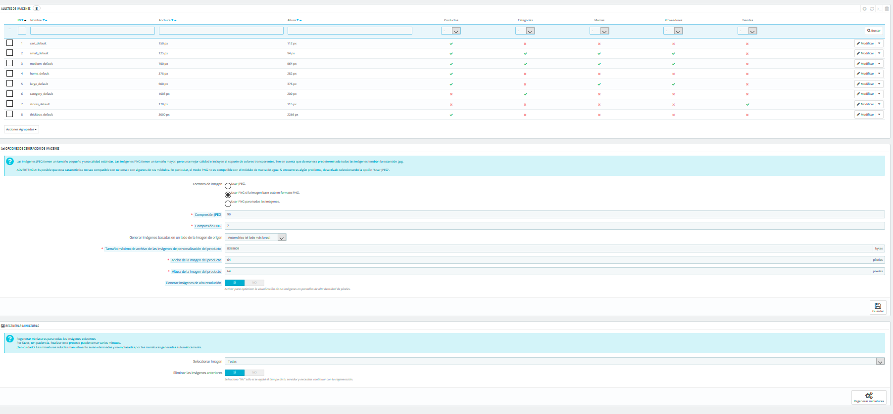 En efecto, la imagen esta redimensionada, pero te paso las configuraciones que yo uso por defecto y que no me da ningun problema, no se si en tu caso tengas marcada la opcion de "Generar imágenes de alta resolución", la unica opcion con la que juego de momento es con la compresion, que en algunas tiendas requiero mayor calidad y la incremento un poco.
