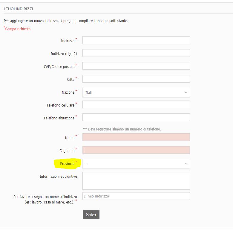 italofares Posted September 18, 2018 Share Posted September 18, 2018 Salve, durante delle modifiche per un modulo delle spedizioni mi ritrovo con i campi dell'indirizzo completamente non ordinati. In particolar modo la provincia me la porta dopo la richiesta di nome e cognome, come da screen allegato. In campi richiesti per gli indirizzi dello stato ho il seguente ordine: Customer:lastname Customer:firstname Customer:company address1 address2 postcode city Country:name phone phone_mobile Qualcuno sa indicarmi il file dove poter andare a cambiare quest'ordine? Grazie Link to comment Share on other sites More sharing options...