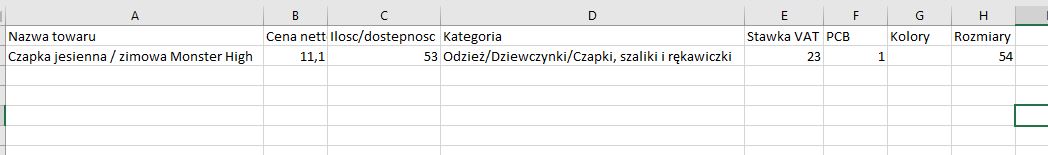 Z pliku CSV niestety nie jestem w stanie zaimportować nic, wywala mi błędy. Więc korzystam z pliku CSV. Do postu załączam screen jednego wiersza z tego, jak wygląda mój plik XLS.