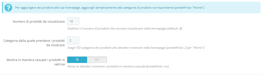 celioth Posted October 1, 2018 Author Share Posted October 1, 2018 1 hour ago, luca1711 said: presumo che nella categoria 2 che hai scelto hai fatto le modifiche o aggiunto prodotti che non vedi, giusto? Se così fosse prova a disinstallare il modulo e reinstallarlo, tanto non succede niente, potrebbe risolverti il problema. La categoria "2", ovvero la "Home", è quella di default di PrestaShop. A quali modifiche fai riferimento? I prodotti sono inseriti sia nella categoria "Home" che nella categoria di appartenenza. Ho provato a disinstallare e a reinstallare il modulo ma nulla. Il modulo in questione è quello del tema. Link to comment Share on other sites More sharing options...