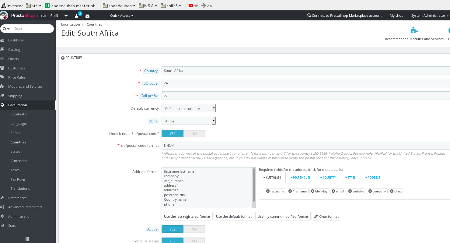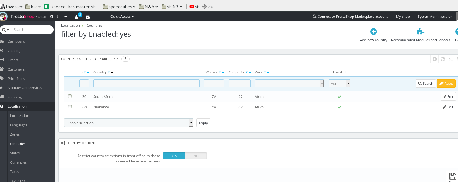 amnonM Posted September 26, 2018 Share Posted September 26, 2018 Hi I've just installed a new instance of prestashop (v. 1.6.1.20). When a new customer wants to enter an address, the dropdown for country is blank. I can't seem to find an answer anywhere, although some people seem to have had similar issues. 1. I have enabled the country South Africa (see the screenshot) 2. The only other country enabled is Zimbabwe (see the screenshot) 3. I have set the default country to South Africa (see the screenshot) Please can someone help with clear instructions! Thanks AMnon Link to comment Share on other sites More sharing options...