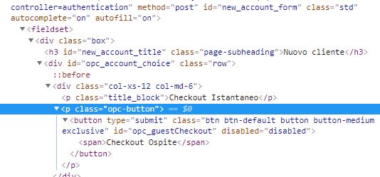 elettroitaly Posted September 26, 2018 Share Posted September 26, 2018 Salve, prestashop versione 1.6.1.19 i pulsanti Checkout ospite e crea account dopo aver caricato la pagina di disabilitano. Dalla immagine, disabled="disabled" non esiste in nessun file opc!vedo che all inizio del caricamento pagina sono abilitati, ma appena finisce di caricare la pagina si disabilitano da soli! controllato il file order-opc-new-account.tpl ma non esiste nessun disable! credo sia un java che mette disable e non so il perchè! altro sito prestashop versione 1.6.1.19 non ha disable! chi mi aiuta? grazie in anticipo! Link to comment Share on other sites More sharing options...