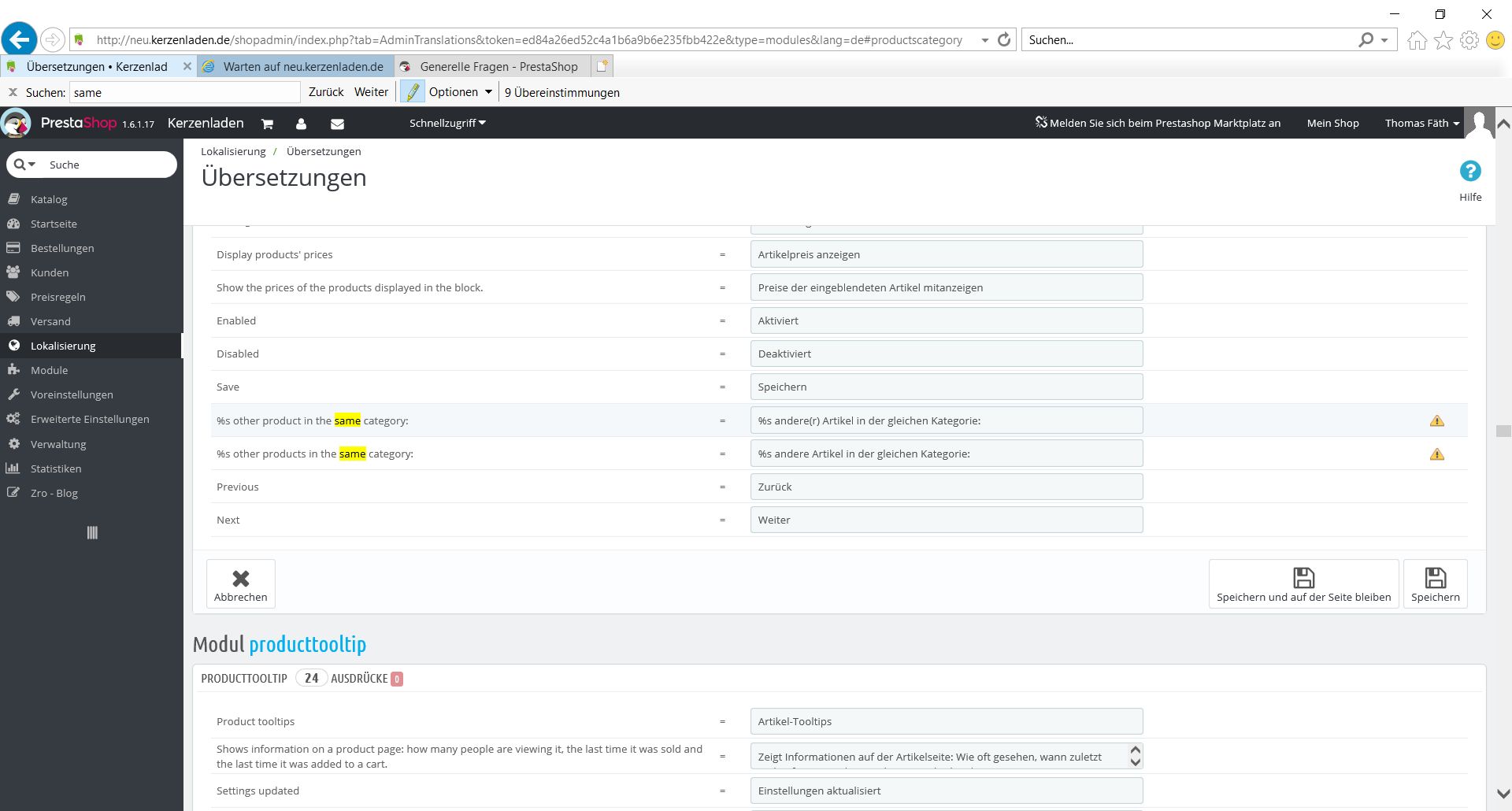 Thomas333 Posted September 28, 2018 Share Posted September 28, 2018 Hallo, benutze Prestashop 1.6.1.17 Einige (nicht alle) Übersetzungen funktionieren nicht obwohl die Deutschen Übersetzungen im rechten Feld richtig eingetragen sind. Liegt das etwa am Template ? Desweiteren sind einige Übersetzungen mit einer Variante zb: %s other products in the same category: = %s andere Artikel in der gleichen Kategorie mit einem gelben Ausrufezeichen versehen. Hier wird die englische Version im Shop angezeigt. Es sind ca. 15 - 20 Variantenübersetzungen mit einem gelben Ausrufezeichen. Weiß hier jemand Abhilfe ? Vielen Dank im Vorraus Link to comment Share on other sites More sharing options...