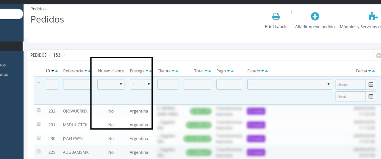 nadie Posted October 1, 2018 Share Posted October 1, 2018 hace 17 minutos, Tritrivm dijo: Hola !!! soy nuevo en prestashop y quiero saber si se pueden ocultar columnas en la grilla de pedidos del panel de control version 1.6 (Adjunto imagen). Desde ya muchas gracias Slds Gonzalo El controlador en Prestashop 1.6 es el fichero => /controllers/admin/AdminOrdersController.php Por ejemplo, la columna nuevo cliente: 'new' => array( 'title' => $this->l('New client'), 'align' => 'text-center', 'type' => 'bool', 'tmpTableFilter' => true, 'orderby' => false, 'callback' => 'printNewCustomer' ), Evidentemente, recomendable hacer override. Saludos, 1 Link to comment Share on other sites More sharing options...