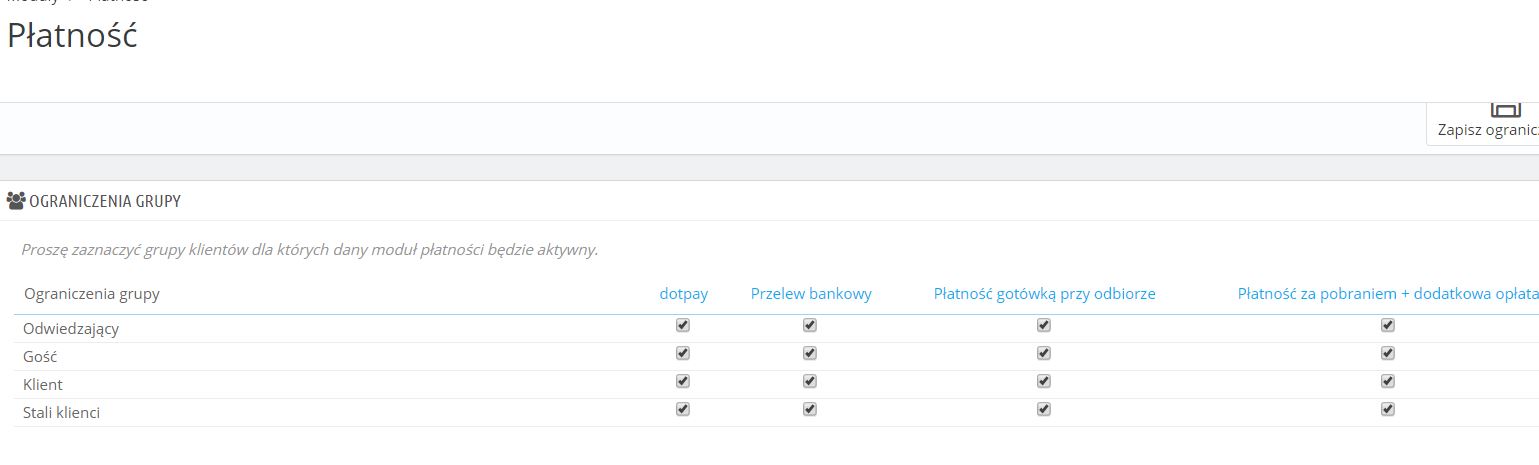 Konfiguruję sklep na PrestaShop 1.6.1.14. Podczas składanie zamówienia jako gość (zakup bez rejestracji) w sekcji metoda płatności pojawia się informacja: metoda płatności dostępna po zalogowaniu (zrzut 1). W sklepie płatności dla wszystkich klientów mam zaznaczone (zrzut 2). Proszę o pomoc.