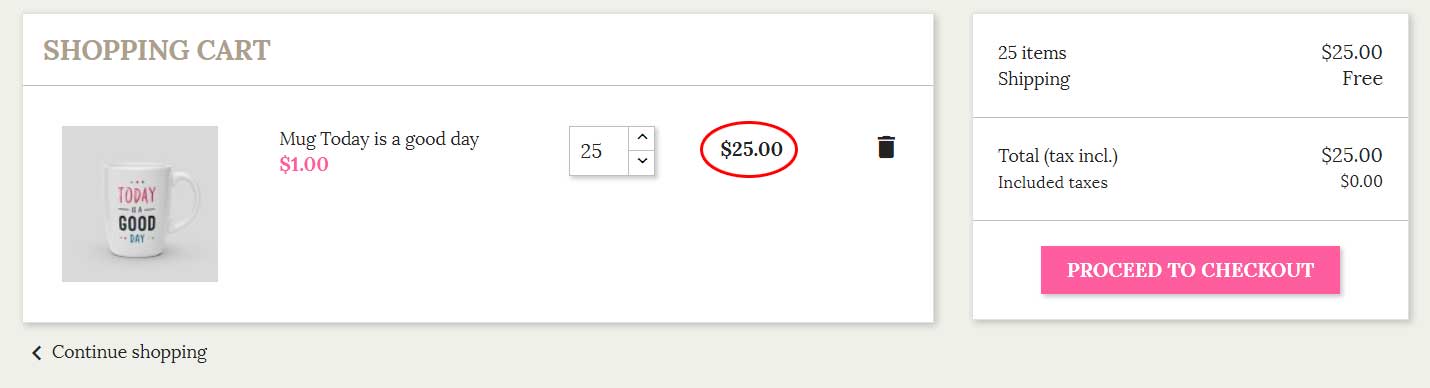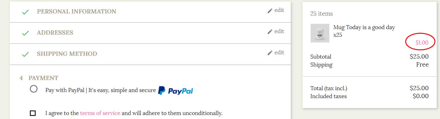Jenetic Posted October 6, 2018 Share Posted October 6, 2018 Hi! If a product costs $1 and the customer adds a quantity of 25 of that product, the checkout summary will still show the price as $1 (although the subtotal will show the right price). I want it to show the product total - just as it does in the shopping cart before checkout. Does anyone know where and how to change that? I've attached two screenshots to show you what I mean. Link to comment Share on other sites More sharing options...