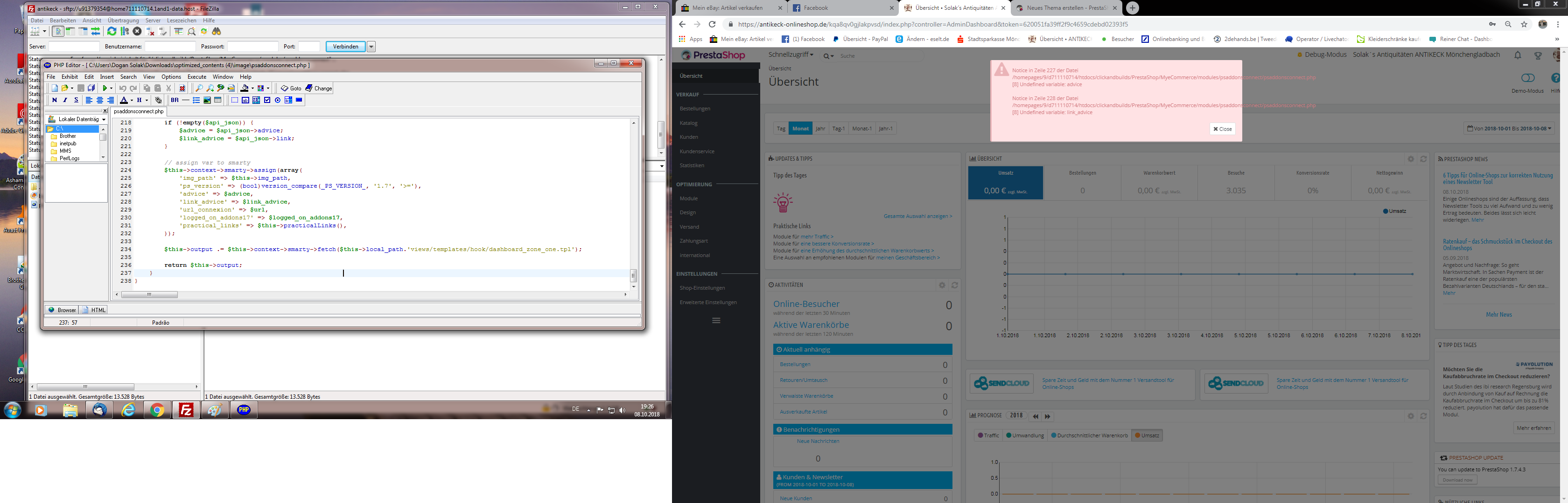 0 eleazar Posted October 9, 2018 Share Posted October 9, 2018 Die Fehlermeldung ist da eindeutig. Scheint also ein Bug deiner Prestashop-Version zu sein. Die beiden Variablen sind nicht deklariert. Es könnte aber auch .... ... mal wieder am Modul Handelserfolg (Gamification) liegen. Das solltest du vielleicht mal deinstallieren. Das wäre auch viel ressourcenschonender, denn brauchen wirst du es vermutlich sowieso nicht. Vielleicht ist dann ja auch der Fehler weg. Link to comment Share on other sites More sharing options...