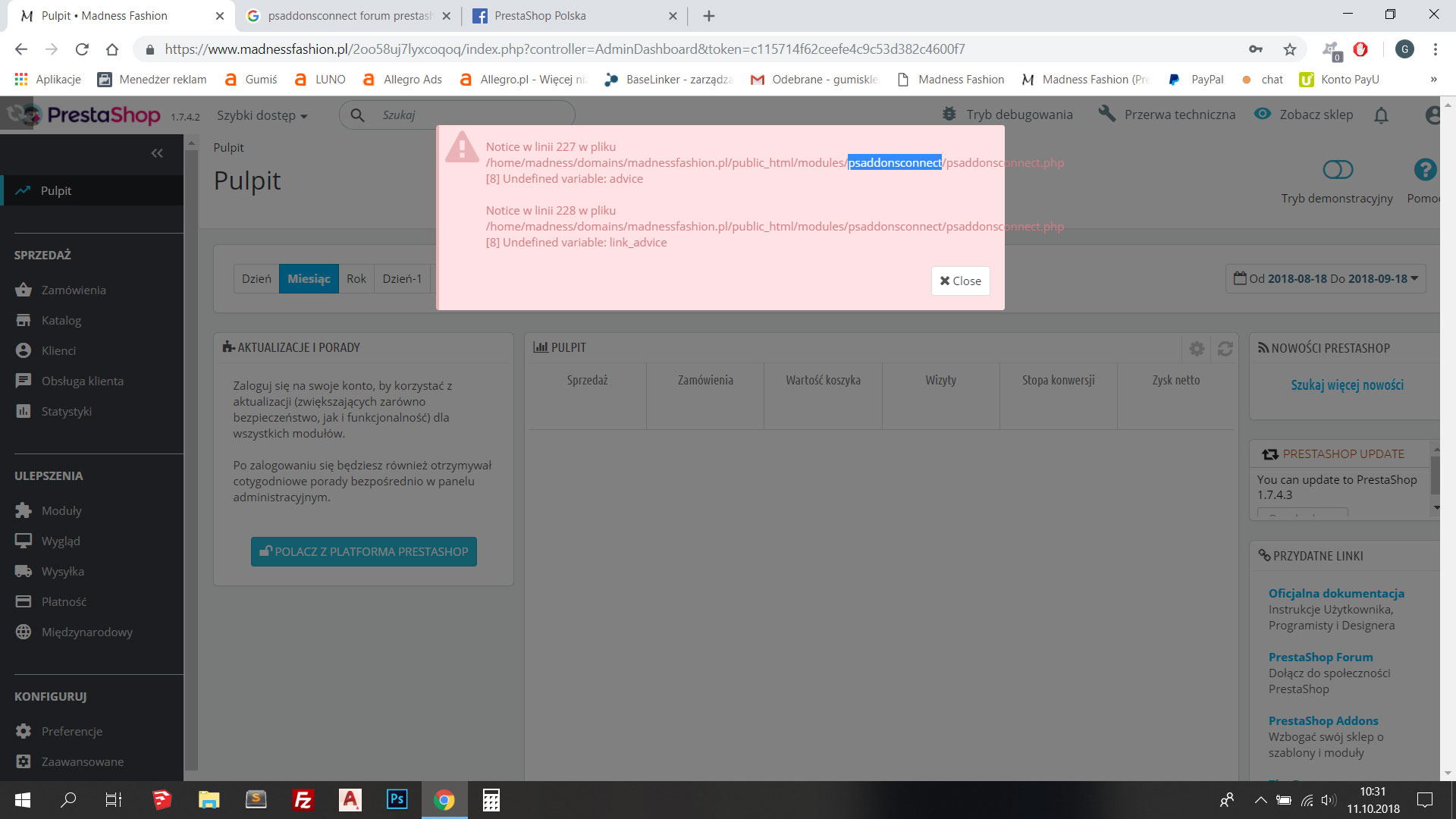 Sam problem pojawił się nagle, bo kilka dni temu dodawałem produkty do magazynu (dokładnie 3) później przez kilka dni nie wchodziłem do panelu, zajrzałem wczoraj i na dzień dobry błędy. Nie zdążyłem nic zrobić, nic zmienić.