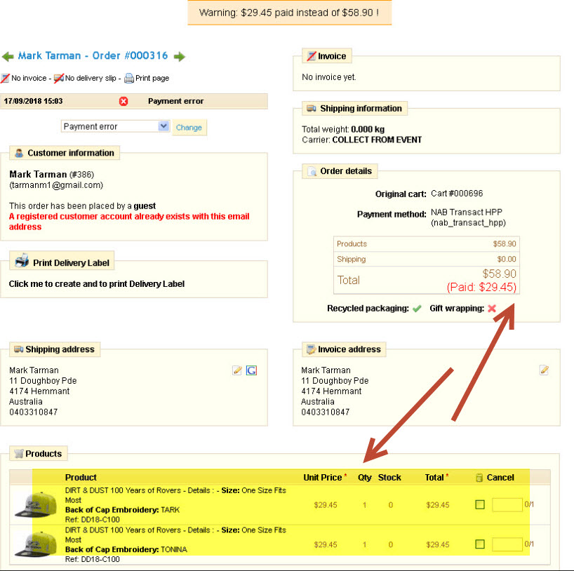 Not sure if anyone else has this issue with 1.6.1.17. Client has ordered a hat for $29.45 that includes a personalised name. They then order the same hat again with a different personalised name for also $29.45. An invoice is created for the total $58.90 however the payment gateway only charges for one hat at $29.45.