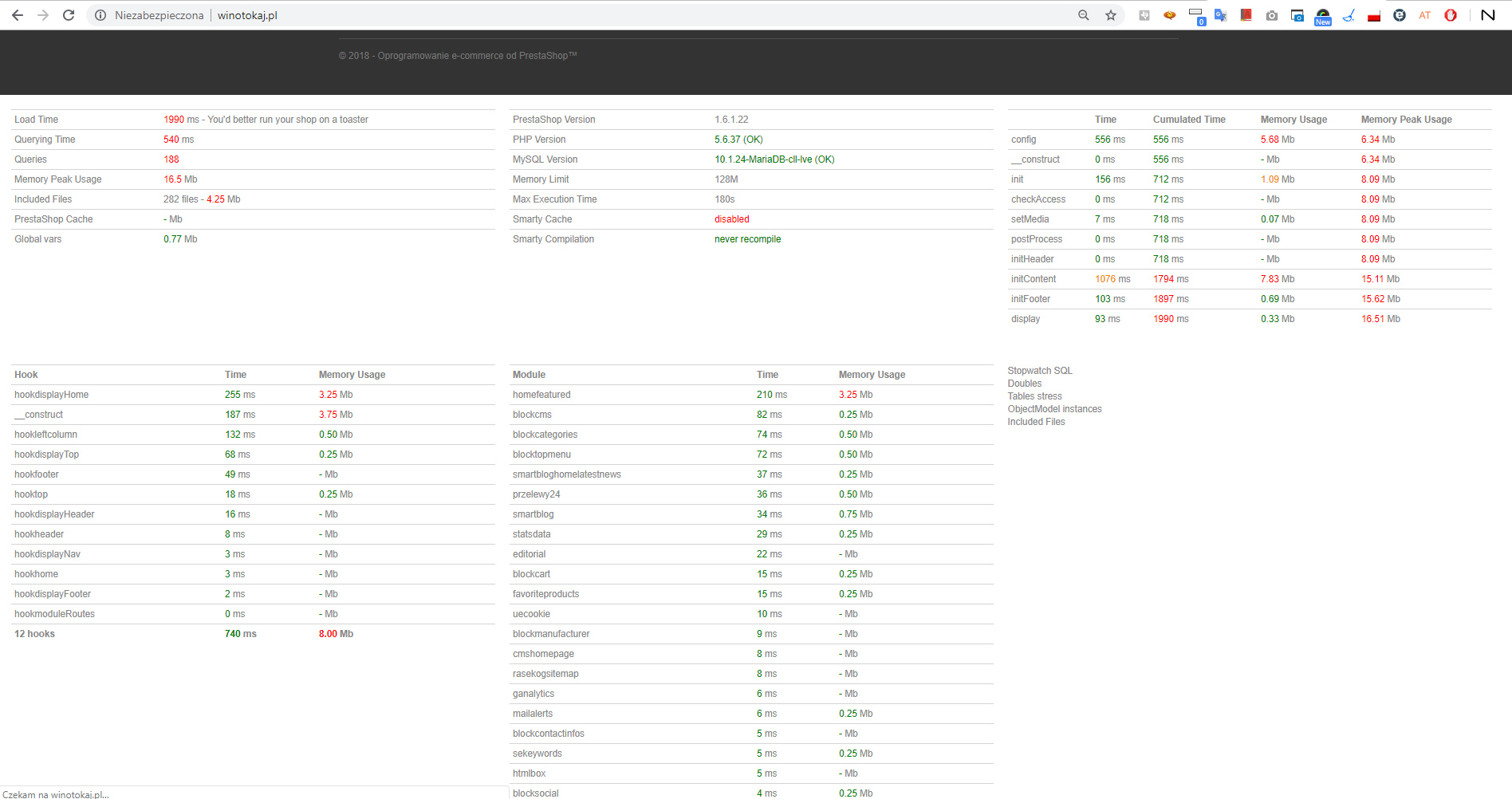 benzior Posted October 22, 2018 Author Share Posted October 22, 2018 Dziekuję za Wasze odpowiedzi. Zacząłem od zaktualizowania presty do najnowszej wersji. Miałem podejrzenie, że przez jakiś plik szablonu może się tak długo ładować jednak po aktualizacji bez zmian. Załączam logi z profilowania .Bardzo dużo wartości jest oznaczone kolorem czerwonym. Czy to któraś z nich może odpowiadac za wolne wczytywanie? Link to comment Share on other sites More sharing options...