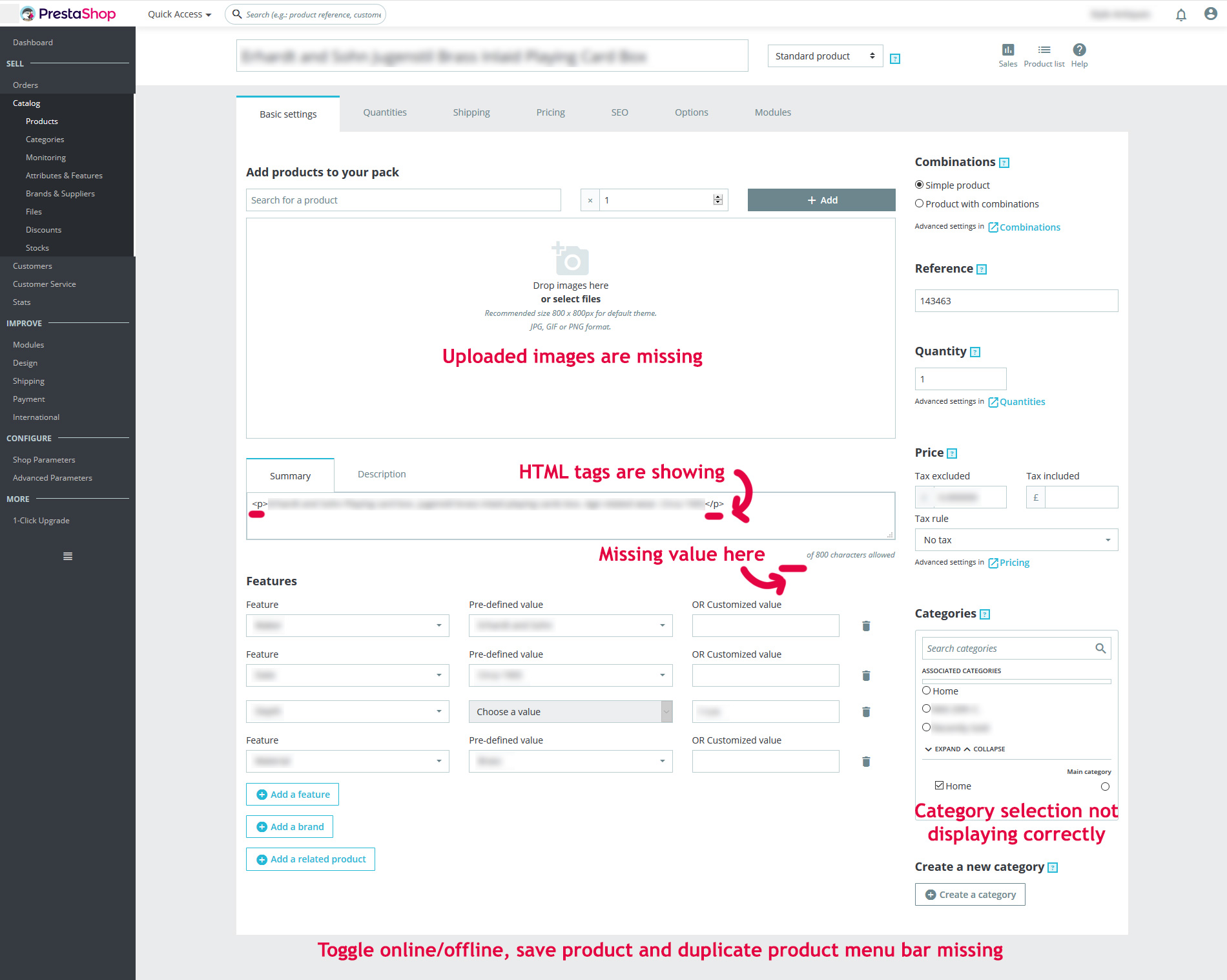 mallrat Posted October 23, 2018 Share Posted October 23, 2018 Hi I have an intermittently recurring issue. On some days the site back office is working OK, on other days the site back office is broken. After logging into the back office if I try to edit or add a product, the back office product page has numerous errors. Prestashop: 1.7.3.3. PHP: 7.0.32 Memory limit: 128M Max execution time: 30 Required parameters: OK Optional parameters: OK When trying to edit an existing product... 1. The uploaded images are missing. 2. HTML tags are showing in the summary and description areas. 3. Character count value is missing. 4. Category chooser panel not loading correctly. 5. The save/duplicate product menu bar at the bottom is entirely missing. The web inspector is showing an error 500 for the fist file that the page tries to load. https://www.mywebsite.com/adminxxxx/index.php/product/form/xxx?_token=xxxxxxxxxxxxxxxxxxxxxxxxxxxxxxxxxxx I have posted previously about this, but I hope this is clearer. I hope someone can help. Thank you. Link to comment Share on other sites More sharing options...