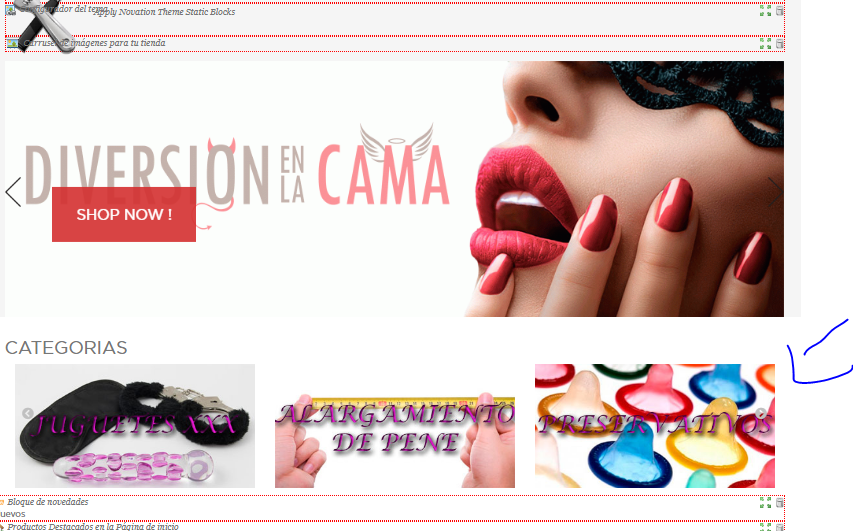 Sergio Ruiz Posted October 29, 2018 Share Posted October 29, 2018 (edited) On 24/10/2018 at 9:06 PM, David García said: Buenas, Gracias por vuestra respuesta. Pero si se tratase de un módulo, no debería aparecer en los posicionamientos, tal y como sale en la imagen no me permite ni mover, ni modificar ni borrar el contenido del slider. Y en el módulo de slider está el slider principal de la web, por tanto ese módulo no puede ser. Entiendo que hablamos del bloque "Categorías" donde se muestran en tu caso 3 imágenes (que en tu tienda se muestra debajo del slider) y no del slider propiamente ¿no? Si dices tu que no es ningún módulo, prueba a ver si están metido ese código en el tpl del modulo del slider que tienes sobrescrito en la plantilla, porque si es así, menuda chapuza por parte del desarrollador de la plantilla suerte. Edited October 29, 2018 by Sergio Ruiz (see edit history) Link to comment Share on other sites More sharing options...