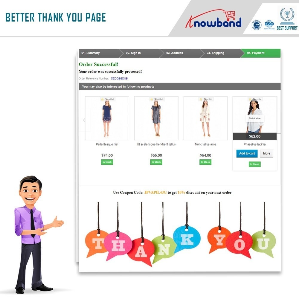 Knowband Plugins Posted November 5, 2018 Share Posted November 5, 2018 Better Thank You Page (Success Page) Module Post-purchase experience plays a vital role in increasing customer loyalty. The Better Thank You Page (Success Page) Module allows the store admin to create the beautiful thank you page on completion of the order. The store admin can display the Related Products, Discount coupon for the next purchase and Banner for Advertisement. The Better Thank You Page module offers the following More info and purchase here: Better Thank You Page (Success Page) Module FRONT DEMO BACK OFFICE DEMO Features of the Better Thank You Page module: General Settings: General Settings tab of the Better Thank You page module allows the store admin to enable the module. Admin can also select the option to display the Order Reference on the Thank You. The sequence of the recommended products, Discount Coupon and Banner Ad block can be selected from the General Settings tab. Products Settings: The store admin can enable the option to display the Related Products on the Thank You page. Admin can set the number of products and text message on the Products block. Discount Settings: Admin can offer the coupon code to the customers which will be applicable on the next order. This is the best way to increase customer retention and loyalty. Coupons can be generated based on the Fixed Discount or Percentage basis. Advertisement Settings: Admin can show a Banner on the Thank You page to increase the brand awareness. Module link: https://addons.prestashop.com/en/registration-ordering-process/21547-knowband-better-thank-you-page-success-page.html Link to comment Share on other sites More sharing options...