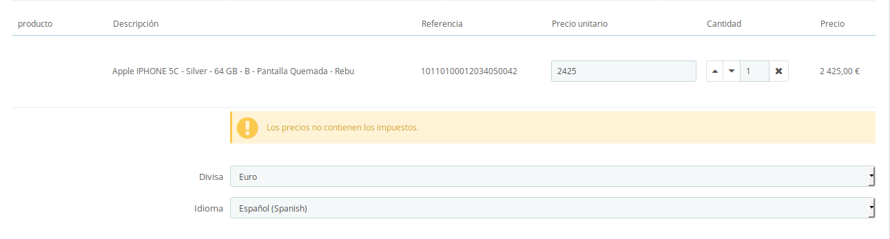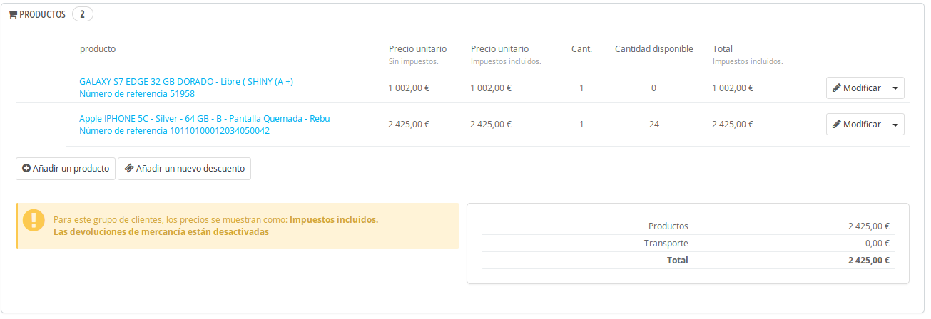 ruben.bautista Posted November 5, 2018 Share Posted November 5, 2018 Estamos realizando un desarrollo con la API de prestashop y para probar que funciona correctamente tenemos que crear un pedido manualmente en Prestashop para poder bajarlo hacia nuestra plataforma, para ello, elegimos un cliente creado por nosotros (Tomás), posteriormente vamos a añadir un producto al pedido y buscamos un producto cualquiera, por ejemplo un Iphone. Posteriormente le damos a añadir al carrito, y se añade sin problema. Para finalizar le damos a guardar pedido y el pedido también se guarda sin ningún tipo de problema. En cambio, cuando vamos a visualizar ese pedido, vemos que en la lista del detalle del pedido hay dos lineas, una linea del producto que habíamos añadido, y otra linea de un producto que se ha añadido sola. El producto Galaxy S7 Edge, no ha sido añadido por nosotros sino que se ha añadido en el proceso de guardado del pedido. Esto nos ha pasado con varios productos y varios pedidos por no decir todos que hemos creado desde Prestashop manualmente. Necesitaríamos saber porque se produce esto, y como solucionarlo ya que esto provoca un error en nuestra sincronización de pedidos desde Prestashop a nuestra plataforma. Muchas gracias! Link to comment Share on other sites More sharing options...