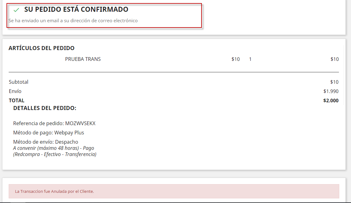 Italo Morales Posted November 9, 2018 Share Posted November 9, 2018 Buenas noches amigos, Tengo prestashop 1.7.4.2 y tengo integrado el modulo de webpay 3.0.6. El problema persiste cuando la transaccion es anulada desde webpay y al volver a mi pagina web, informa que el pedido se encuentra confirmado y bajando en la pagina, informa que la transaccion se encuentra anulada. Que puedo hacer para que no muestre que el pedido se encuentra confirmado, siendo que hubo problemas?? Link to comment Share on other sites More sharing options...