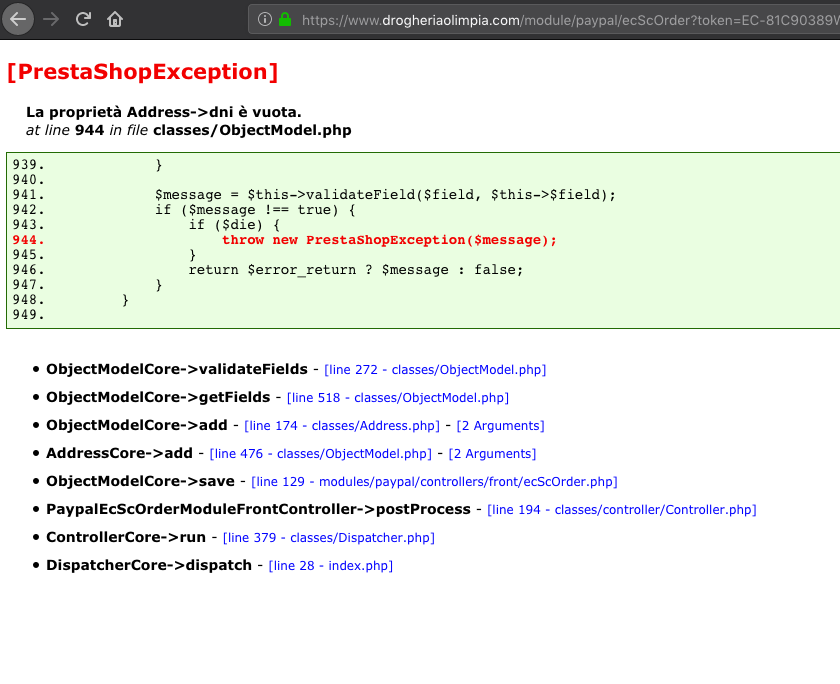 @diegofrancesco Posted November 9, 2018 Share Posted November 9, 2018 Hello, I have the last version of Paypal module on Prestashop 1.7.2.4, the classic payment mode in the checkout page its ok, the problem is with the shortcut in the cart because it doesn't work. I click on the PayPal button in the cart of my website, then the module redirect me at PayPal site, I login, but when I click on "pay now" button the system show me an error 500 page from my site. How can I solve it? I have used the debug mode for display error, but I don't understand where is the problem with the property Address (see attachment). Thank you so much for your support. Link to comment Share on other sites More sharing options...