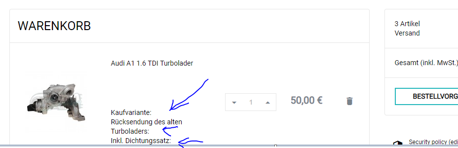 Wenn ich nun eine Variante auswähle und den Artikel dem Warenkorb hinzufüge fehlt die Information im Warenkorb.