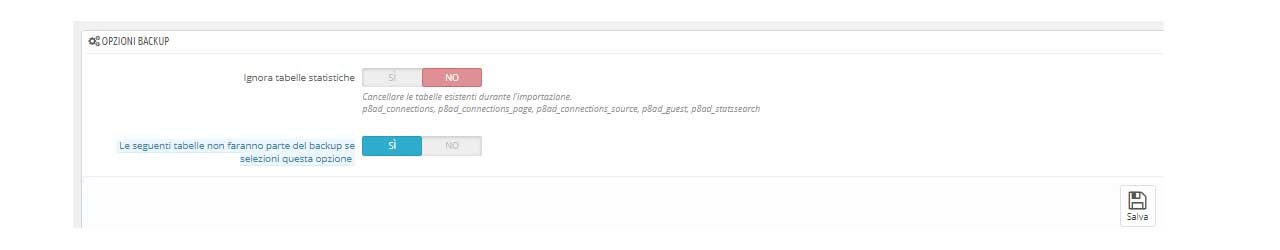 nello Posted November 26, 2018 Share Posted November 26, 2018 Salve, nel menu di backup su ps1.7.2.3 ci sono le due seguenti opzioni di cui allego anche printscreen: Ignora tabelle statistiche SI o NO Le seguenti tabelle non faranno parte del backup se selezioni questa opzione SI o NO Sapreste consigliarmi quale opzione su SI o NO esercitare su entrambe?? Link to comment Share on other sites More sharing options...