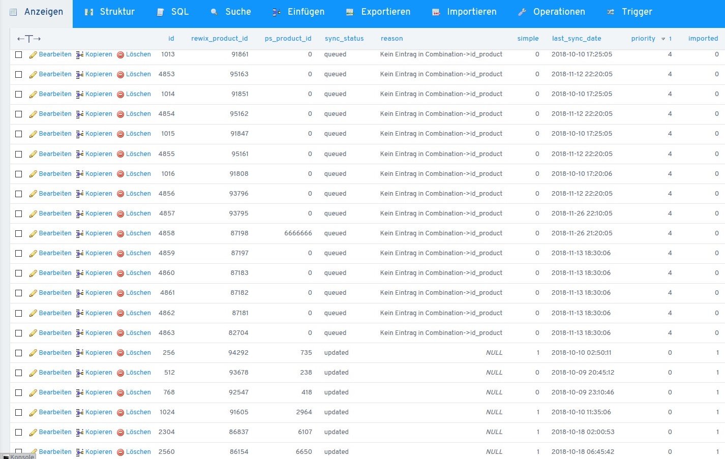 Der angehängte Screenshot ist aus der Datenbank. Die fehlerhaften Uploads haben keine "ps_product_id". Die Vergabe der Nr. "6666666" wurde von mit manuell vergeben umzu testen ob der Fehler so behoben werden könnte. Ggfs. verschafft eine Änderung im PrestaShop Code bzgl. der "ps_product_id" hier Abhilfe. Jedoch habe ich bisher die passende Datei und entsprechend die Codezeilen nicht gefunden.
