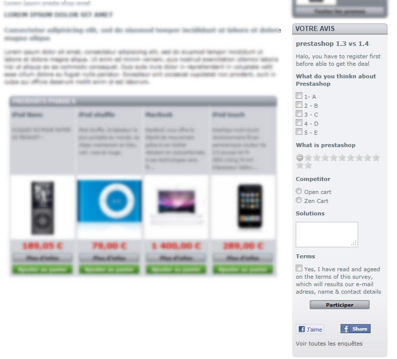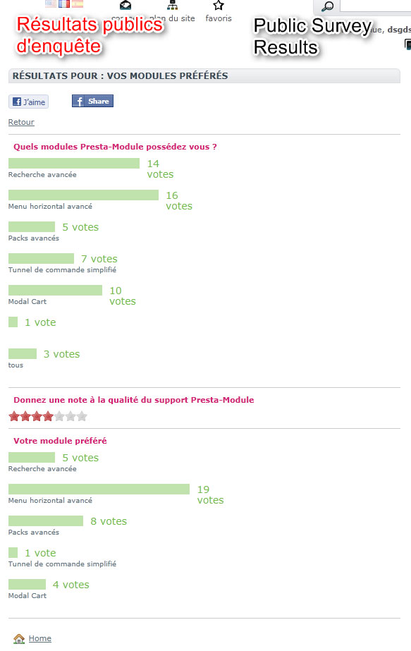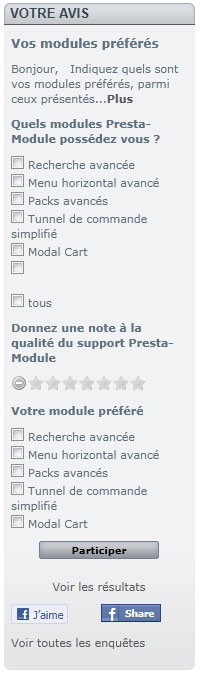[PrestaModule] JS Posted July 28, 2011 Share Posted July 28, 2011 Nouvelle version 1.2 disponible dans votre espace client Presta-Module et bientôt disponible sur Prestashop Addons. Petit rappel de certaines fonctions avancées du module : Création de questionnaires / votes / enquêtes à la volée. Possibilité de les placer sur les hooks suivant : rightColumn leftColumn home extraRight productfooter orderConfirmation createAccountForm extraLeft Possibilité d'ajouter un questionnaire dans le formulaire d'inscription Possibilité d'envoyer une invitation a un questionnaire à la suite d'une commande (basé sur le statut de la commande) J'en profite pour vous faire passer de nouvelles captures d'écran du Front Office. Elles étaient manquantes . 1 Link to comment Share on other sites More sharing options...