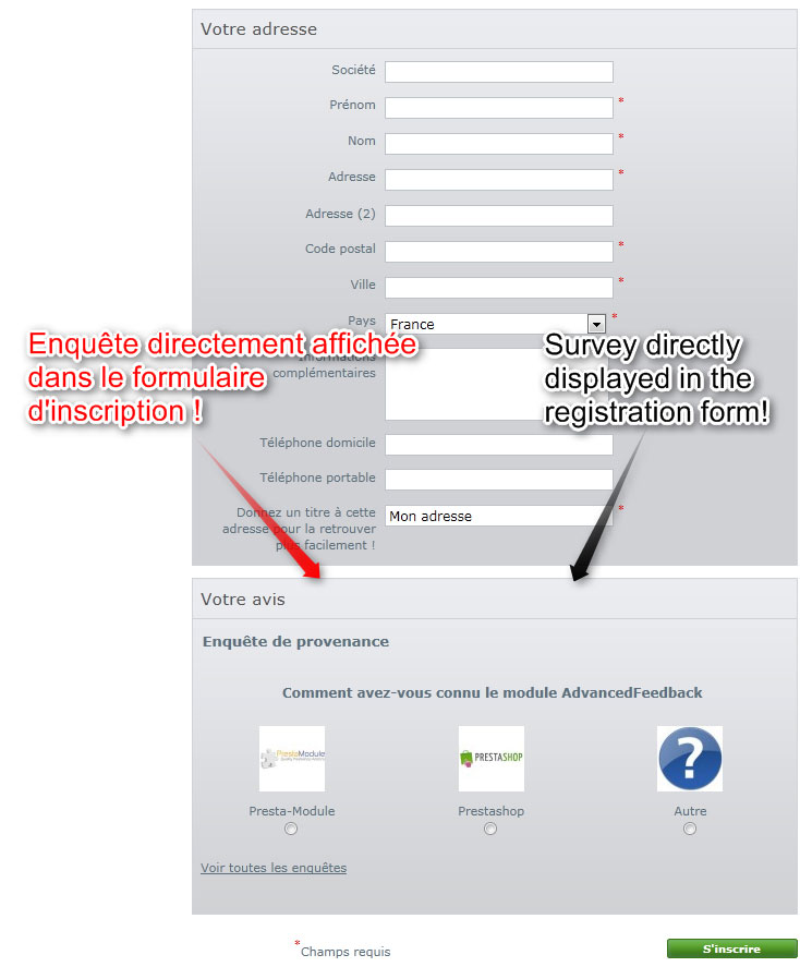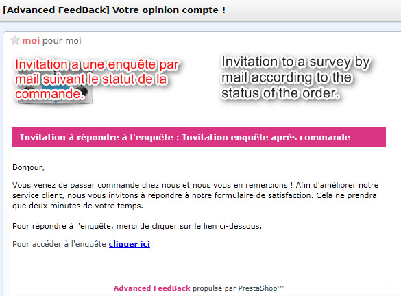 [PrestaModule] Steph Posted February 28, 2011 Share Posted February 28, 2011 (edited) Advanced FeedBack version 1.3.3 - publiée le 9 Mai 2012 Démonstration Achetez le dès maintenant sur: Presta-Module.comau prix de 89.90€ HT Description : Le module Enquêtes Avancées est la solution la plus aboutie à ce jour pour identifier le profil de vos clients afin d'adapter ou de parfaire votre activité e-commerce. Outil essentiel pour les services marketing et commerciaux, il vous permet de créer sur votre boutique Prestashop, des enquêtes, sondages, et votes, afin de cibler au mieux votre clientèle. Fonctionnalités Back-Office : Création simplifiée des enquêtes Personnalisation graphique simplifiée ou avancée avec éditeur CSS intégré Compatible Facebook Gestion des autorisations d'accès (public, identifiés, groupes de clients) Emplacements multiples (privé, accueil, colonnes latérales, produit, catégories, création de compte, confirmation de commande...) Possibilité d'affichage sur une sélection de produits ou catégories Résultats publics ou privés Plannification automatique Types de réponses : choix unique, choix multiple, réponse libre, notation Statistiques détaillées illustrées de graphiques Invitation automatique par e-mail au changement d'état d'une commande Statistiques : Des statistiques illustrées de graphiques donnent des informations détaillées sur les participations : nombre de consultations nombre de participations nombre de consultations uniques nombre de participations uniques moyennes Intégration Front-Office : Comme tous nos modules, Enquêtes avancées est livré pour le thème standard de Prestashop, et peut également s'intégrer à votre thème personnalisé. Vous avez la possibilité d'afficher autant d'enquêtes que vous souhaitez sur votre boutique, et aux emplacements de votre choix. Vous pouvez également décider d'envoyer automatiquement par e-mail une invitation à participer à une enquête privée au changement de statut d'une commande afin de récolter les avis de vos clients une fois leur commande réceptionnée par exemple ! Compatibilité Prestashop : 1.2, 1.3, 1.4 Changelog : 1.3.3 added new footer 1.3.2 Module key added 1.3.1 Fixed a bug with dates on SQL request Fixed a bug preventing the SQL save on quoted fields Added same date start/end on feedback Now using last version of TinyMCE if PS > 1.4 1.3 Fixed save langs answers Added clear after rating star Fixed conflict with productscomments module 1.2 Fixed tpl layout 1.1 Fixed feedback Permissions Documentation AdvancedFeedBack FR.pdf Edited May 10, 2012 by [PrestaModule] Steph (see edit history) Link to comment Share on other sites More sharing options...