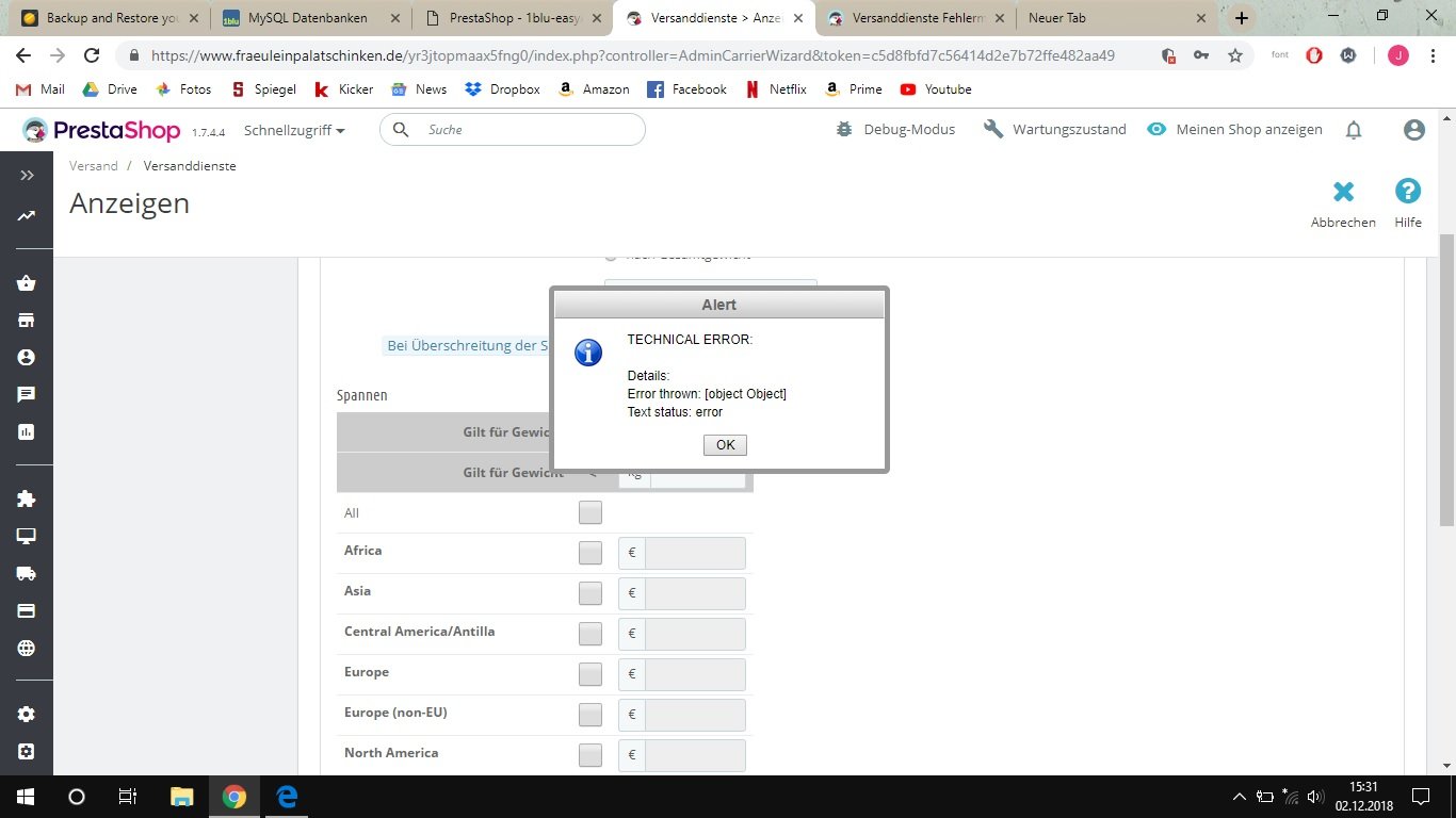 asdkhgasihg Posted December 2, 2018 Author Share Posted December 2, 2018 Hier die Fehlermeldung. Debug ist aktiviert, leider veschwindet aber die Leiste unten mit den Debug Infos sobald ich auf Versanddienste klicke. Link to comment Share on other sites More sharing options...