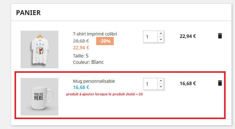 Jluis Posted December 10, 2018 Share Posted December 10, 2018 salut , je suis en train de développer mon premier module Prestashop , je voudrais ajouter automatiquement au panier un deuxième produit si un produit d'identifiant spécifique a été choisi , la fonction ci -dessous ajoute pour tous les produits un produit specifique or ce n'est pas le cas , je veux lors je choisie suelemnt le produit id = 20 , l'autre s'ajoute automatiquement au panier . une idée s'il vous plaît public function addSpecificProduct(){ //automatic adding to cart $static_product = new product(19 , false , null , null , null ); $productID = $static_product->id; $productAttributeID = Product::getDefaultAttribute($productID); $qty = 1; $this->context->cart->updateQty( $qty, $productID, $productAttributeID, $this->customization_id, Tools::getValue('op', 'up'), $this->id_address_delivery, null, true, true ); $this->context->cart->update(); return true; } j'ai fait appel à cette fonction au niveau de la fonction updateCart() ( cartController). Link to comment Share on other sites More sharing options...