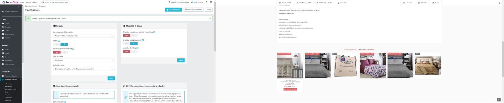 Genco89 Posted December 18, 2018 Share Posted December 18, 2018 Salve a tutti, avrei un problema (l'ultimo spero prima di poter mettere online il sito) che proprio non riesco a risolvere in nessun modo. In pratica, quando la cache dal BO è disattivata il modulo funziona correttamente, ma non appena l'attivo, solo ed esclusivamente il primo articolo dei 16 totali impostati da far visualizzare nel modulo product category presenta la descrizione, il prezzo, il marchio ecc... i restanti 15 appaiono solo come foto che scorrono nel carosello (posso cliccarci e andare nella pagina del prodotto in entrambi i casi). Allego foto per esporre meglio il problema. Ps. Versione prestashop 1.7.4.4. Template non nativo, ho già parlato con il supporto del template ma dicono che è un problema di quel modulo, quindi non danno assistenza su tutto ciò che non riguarda problemi relativi al template. Spero possiate aiutarmi, Grazie in anticipo. CACHE ON CACHE OFF Link to comment Share on other sites More sharing options...