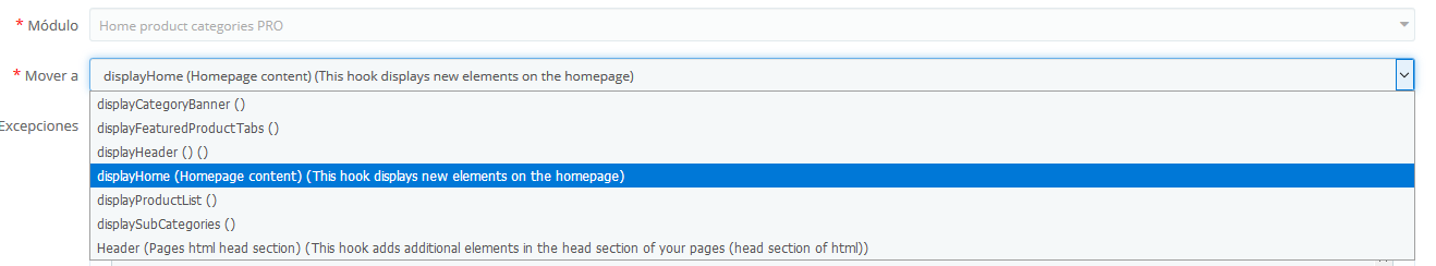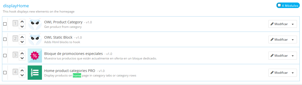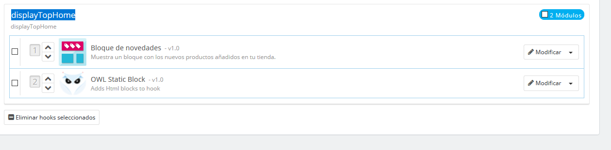 Juan-Shunfa Posted December 19, 2018 Share Posted December 19, 2018 Buenas tardes. Tengo prestashop 1.7.4.4 con una plantilla "Electronic Supermarket" y recientemente adquirí un módulo llamado Home Products Pro, el problema viene con este último y es que al instalar el módulo por defecto se fija al hook DisplayHome, este en la plantilla está configurado como si fueran dos columnas, por lo que el modulo no se expande al ancho total que es lo que yo quiero. Por ese motivo me he fijado que el resto de elementos de la web que si están en un ancho completo están fijados al DisplayTopHome, que es el hook donde estoy intentando vincular el módulo pero no me da esa opción. ¿Qué debo hacer para que si me deje enlazarlo al hook displayTopHome? O¿ hay alguna forma de quizá reorganizar el otro hook que es a dos columnas y dejarlo a una o quizá crear un nuevo hook alguna forma que me permita hacer lo que quiero? Gracias, adjunto capturas Link to comment Share on other sites More sharing options...