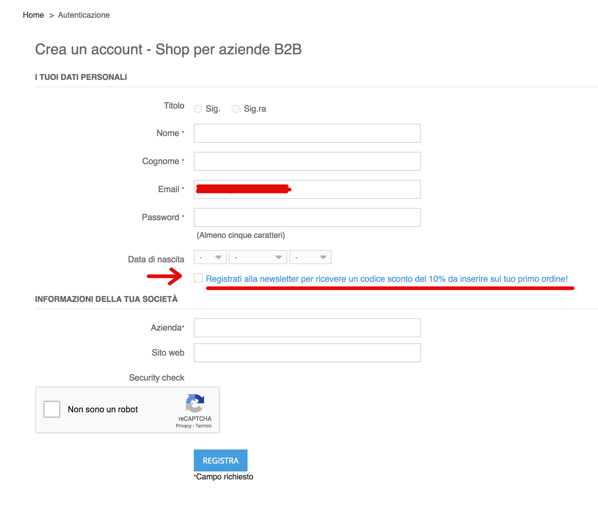 presta_2018 Posted December 20, 2018 Share Posted December 20, 2018 Salve a tutti, sono un principiante di prestashop e ho la necessità di cambiare una parte nella registrazione di un nuovo cliente. Premetto che era già creato il sito quando sono arrivato in questa azienda. Allego schermata. Io dovrei poter modificare la riga che ho contrassegnato con la freccia rossa. Qualcuno sa dirmi dove devo andare per fare questa modifica? Grazie Link to comment Share on other sites More sharing options...
