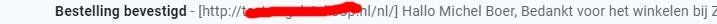 tukker Posted December 23, 2018 Share Posted December 23, 2018 Het lukt me maar niet om het subject juist aan te passen. Ik heb al wel de shop name er uit gekregen door in classes/mail.php regel $subject = '['.Configuration::get('PS_SHOP_NAME', null, null, $id_shop).'] '.$subject; tussen */ /* te plaatsen. Maar nu staat er ook nog in de subject regel mijn domeinnaam. Nu ook testversie Er staat nu dus Bestelling bevestigd - [http://url van de shop] Hallo ....... Ik wil [http://url van de shop] verwijderen uit het subject. Zie bijlage Link to comment Share on other sites More sharing options...