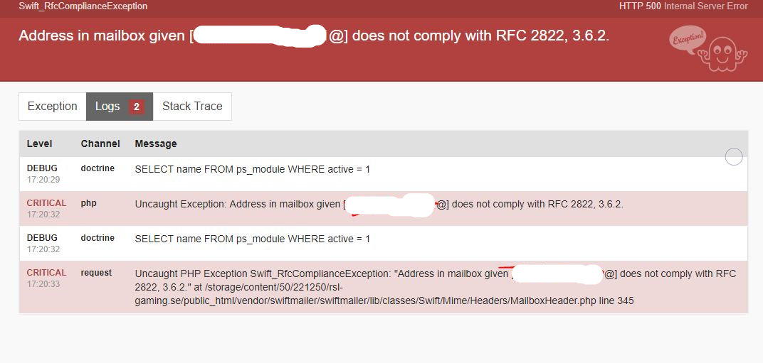 gorkij Posted December 26, 2018 Author Share Posted December 26, 2018 Right. I might not be the brightest PHP-wrench in the box, but the error is still around. Check the attachment : it just forwards the first part of an email adress up to the at-sign which in turn creates an exeption since it's not a valid adress. Knocking my nogging tells me that this is an error in MailboxHeader.php somehow. Now; anyone know how to adress this? The email adress given by my customer is correct. This happens for all customers. Including at checkout, causing payment module faults. (Yes, I *could* turn off all emails to customers. But that'd be stupid so no.) Link to comment Share on other sites More sharing options...
