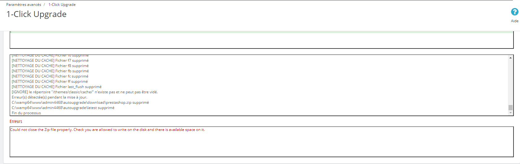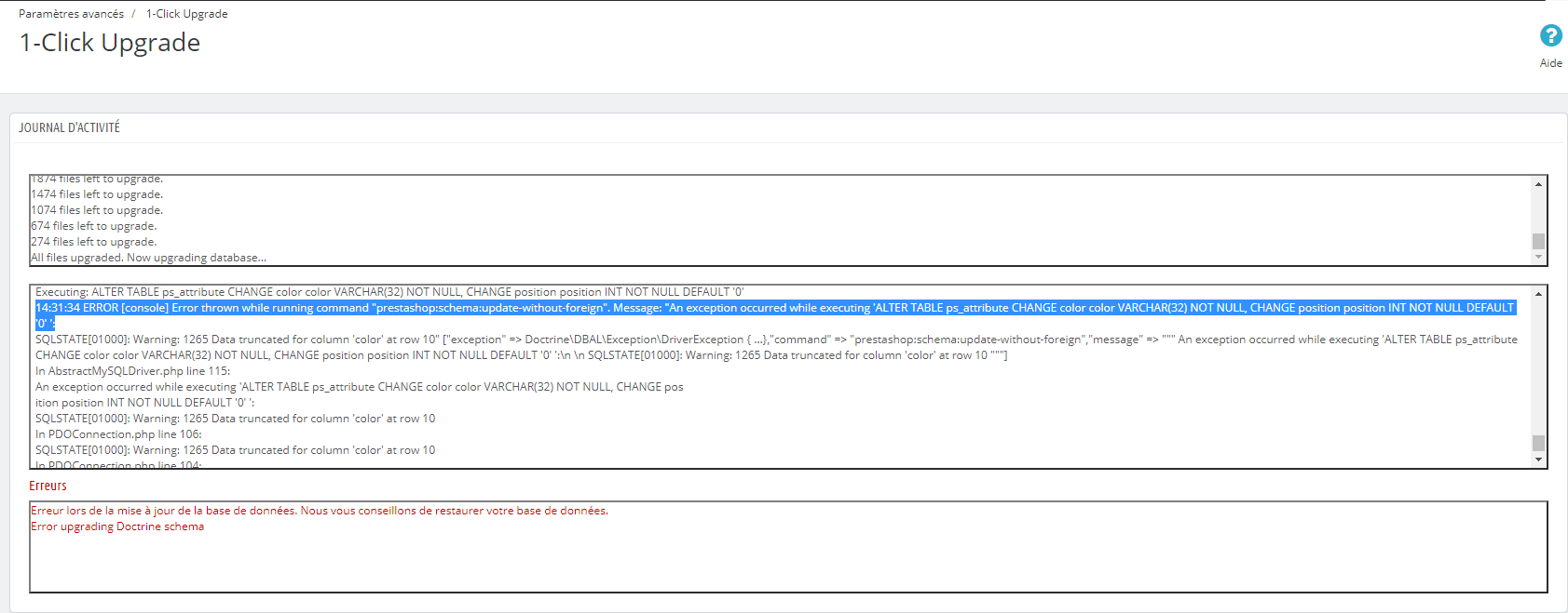 MichalMarcek Posted December 26, 2018 Share Posted December 26, 2018 (edited) Hi, Yesterday I tried to update my prestashop 1.6.1.19 to 1.7.5.0. I did not succeed. I used the 1-Click Upgrade module. All checklist was green. Version comparison: PrestaShop Original version: 171 file modifications have been detected, including 101 from core and native modules: Differences between versions: 1761 files will be modified, 1420 files will be deleted (if they are found). I could start the upgrade. But at the very end of the upgrade this error occurred: "error updating doctrine schema" and I had to rollback. THE WHOLE ERROR LOG: [WARNING] SQL 1.7.5.0 1060 in ALTER TABLE `ps_stock_available` ADD `location` VARCHAR(255) NOT NULL DEFAULT '' AFTER `out_of_stock`: Duplicate column name 'location' Updating database schema... Executing: CREATE TABLE ps_module_history (id INT AUTO_INCREMENT NOT NULL, id_employee INT NOT NULL, id_module INT NOT NULL, date_add DATETIME NOT NULL, date_upd DATETIME NOT NULL, PRIMARY KEY(id)) DEFAULT CHARACTER SET utf8 COLLATE utf8_unicode_ci ENGINE = InnoDB Executing: CREATE TABLE ps_admin_filter (id INT AUTO_INCREMENT NOT NULL, employee INT NOT NULL, shop INT NOT NULL, controller VARCHAR(60) NOT NULL, action VARCHAR(100) NOT NULL, filter LONGTEXT NOT NULL, UNIQUE INDEX admin_filter_search_idx (employee, shop, controller, action), PRIMARY KEY(id)) DEFAULT CHARACTER SET utf8 COLLATE utf8_unicode_ci ENGINE = InnoDB Executing: CREATE TABLE ps_translation (id_translation INT AUTO_INCREMENT NOT NULL, id_lang INT NOT NULL, `key` TEXT NOT NULL, translation TEXT NOT NULL, domain VARCHAR(80) NOT NULL, theme VARCHAR(32) DEFAULT NULL, INDEX IDX_ADEBEB36BA299860 (id_lang), INDEX `key` (domain), PRIMARY KEY(id_translation)) DEFAULT CHARACTER SET utf8 COLLATE utf8_unicode_ci ENGINE = InnoDB Executing: DROP INDEX id_lang ON ps_attribute_lang Executing: CREATE INDEX IDX_3ABE46A77A4F53DC ON ps_attribute_lang (id_attribute) Executing: CREATE INDEX IDX_3ABE46A7BA299860 ON ps_attribute_lang (id_lang) Executing: DROP INDEX lang_iso_code ON ps_lang Executing: ALTER TABLE ps_lang CHANGE active active TINYINT(1) NOT NULL DEFAULT '0' , CHANGE iso_code iso_code VARCHAR(2) NOT NULL, CHANGE language_code language_code VARCHAR(5) NOT NULL, CHANGE date_format_lite date_format_lite VARCHAR(32) NOT NULL DEFAULT 'Y-m-d' , CHANGE date_format_full date_format_full VARCHAR(32) NOT NULL DEFAULT 'Y-m-d H:i:s' , CHANGE is_rtl is_rtl TINYINT(1) NOT NULL DEFAULT '0' Executing: CREATE INDEX IDX_2F43BFC7BA299860 ON ps_lang_shop (id_lang) Executing: DROP INDEX id_shop ON ps_lang_shop Executing: CREATE INDEX IDX_2F43BFC7274A50A0 ON ps_lang_shop (id_shop) Executing: ALTER TABLE ps_attribute_group CHANGE is_color_group is_color_group TINYINT(1) NOT NULL DEFAULT '0' , CHANGE group_type group_type VARCHAR(255) NOT NULL DEFAULT 'select' , CHANGE position position INT NOT NULL DEFAULT '0' Executing: CREATE INDEX IDX_DB30BAAC67A664FB ON ps_attribute_group_shop (id_attribute_group) Executing: DROP INDEX id_shop ON ps_attribute_group_shop Executing: CREATE INDEX IDX_DB30BAAC274A50A0 ON ps_attribute_group_shop (id_shop) Executing: CREATE INDEX IDX_4653726C67A664FB ON ps_attribute_group_lang (id_attribute_group) Executing: CREATE INDEX IDX_4653726CBA299860 ON ps_attribute_group_lang (id_lang) Executing: ALTER TABLE ps_tab_lang CHANGE name name VARCHAR(128) NOT NULL Executing: CREATE INDEX IDX_CFD9262DED47AB56 ON ps_tab_lang (id_tab) Executing: CREATE INDEX IDX_CFD9262DBA299860 ON ps_tab_lang (id_lang) Executing: DROP INDEX class_name ON ps_tab Executing: DROP INDEX id_parent ON ps_tab Executing: ALTER TABLE ps_tab CHANGE class_name class_name VARCHAR(64) DEFAULT NULL, CHANGE position position INT NOT NULL, CHANGE active active TINYINT(1) NOT NULL DEFAULT '1' , CHANGE hide_host_mode hide_host_mode TINYINT(1) NOT NULL DEFAULT '0' , CHANGE icon icon VARCHAR(32) DEFAULT '' Executing: DROP INDEX id_category ON ps_shop Executing: DROP INDEX id_shop_group ON ps_shop Executing: ALTER TABLE ps_shop CHANGE id_category id_category INT NOT NULL DEFAULT '1' , CHANGE theme_name theme_name VARCHAR(255) NOT NULL, CHANGE active active TINYINT(1) NOT NULL DEFAULT '1' , CHANGE deleted deleted TINYINT(1) NOT NULL DEFAULT '0' Executing: CREATE INDEX IDX_CBDFBB9EF5C9E40 ON ps_shop (id_shop_group) Executing: DROP INDEX deleted ON ps_shop_group Executing: ALTER TABLE ps_shop_group CHANGE active active TINYINT(1) NOT NULL DEFAULT '1' , CHANGE deleted deleted TINYINT(1) NOT NULL DEFAULT '0' Executing: ALTER TABLE ps_attribute CHANGE color color VARCHAR(32) NOT NULL, CHANGE position position INT NOT NULL DEFAULT '0' 04:02:07 ERROR [console] Error thrown while running command "prestashop:schema:update-without-foreign". Message: "An exception occurred while executing 'ALTER TABLE ps_attribute CHANGE color color VARCHAR(32) NOT NULL, CHANGE position position INT NOT NULL DEFAULT '0' ': SQLSTATE[01000]: Warning: 1265 Data truncated for column 'color' at row 1" ["exception" => Doctrine\DBAL\Exception\DriverException { …},"command" => "prestashop:schema:update-without-foreign","message" => """ An exception occurred while executing 'ALTER TABLE ps_attribute CHANGE color color VARCHAR(32) NOT NULL, CHANGE position position INT NOT NULL DEFAULT '0' ':\n \n SQLSTATE[01000]: Warning: 1265 Data truncated for column 'color' at row 1 """] In AbstractMySQLDriver.php line 115: An exception occurred while executing 'ALTER TABLE ps_attribute CHANGE colo r color VARCHAR(32) NOT NULL, CHANGE position position INT NOT NULL DEFAULT '0' ': SQLSTATE[01000]: Warning: 1265 Data truncated for column 'color' at row 1 In PDOConnection.php line 106: SQLSTATE[01000]: Warning: 1265 Data truncated for column 'color' at row 1 In PDOConnection.php line 104: SQLSTATE[01000]: Warning: 1265 Data truncated for column 'color' at row 1 prestashop:schema:update-without-foreign [-h|--help] [-q|--quiet] [-v|vv|vvv|--verbose] [-V|--version] [--ansi] [--no-ansi] [-n|--no-interaction] [-e|--env ENV] [