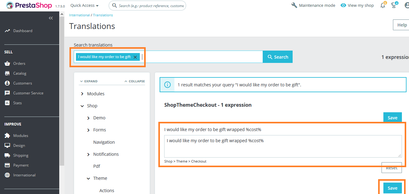 Hi. I want to change "I would like my order to be gift wrapped" and other texts related to gift wraping to something else. Can you tell me where I can change it? I was looking for it inInternational - Translation but I could not find it. I have Prestashop 1.7.5