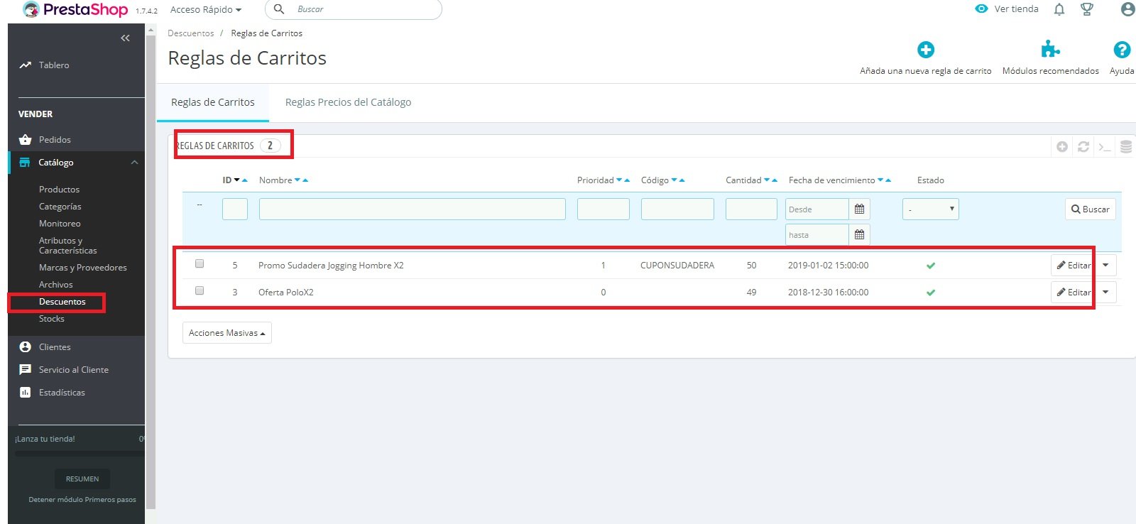 He creado dos reglas de carrito para dos productos específicos. La regla consiste en que a partir de 2 unidades tengo un precio especial y el envío es gratis. El problema es que después de crearlas no se visualizan en mi tienda.