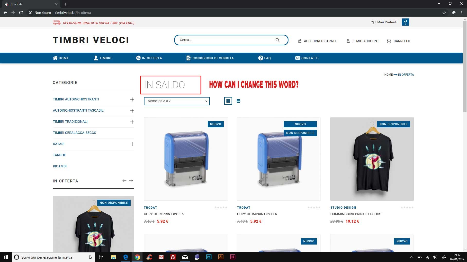 klainkk Posted January 7, 2019 Share Posted January 7, 2019 (edited) Ho cercato nella sezione traduzioni di Prestashop, di cambiare la parola IN SALDO nella pagina Prodotti in Offerta (img1) Qualcuno conosce il modo per modificarla?? Anche nel file product-list.tpl la stringa è <h2 class="h2">{$listing.label}</h2> ma modificandola vado a cambiare tutti i titoli delle altre pagine di categoria. Ho chiesto anche al supporto del mio tema ma mi dice che dovrebbe essere da qualche parte ma non la trova. Mi ha consigliato quindi di rivolgermi alla community. Edited January 7, 2019 by klainkk (see edit history) Link to comment Share on other sites More sharing options...