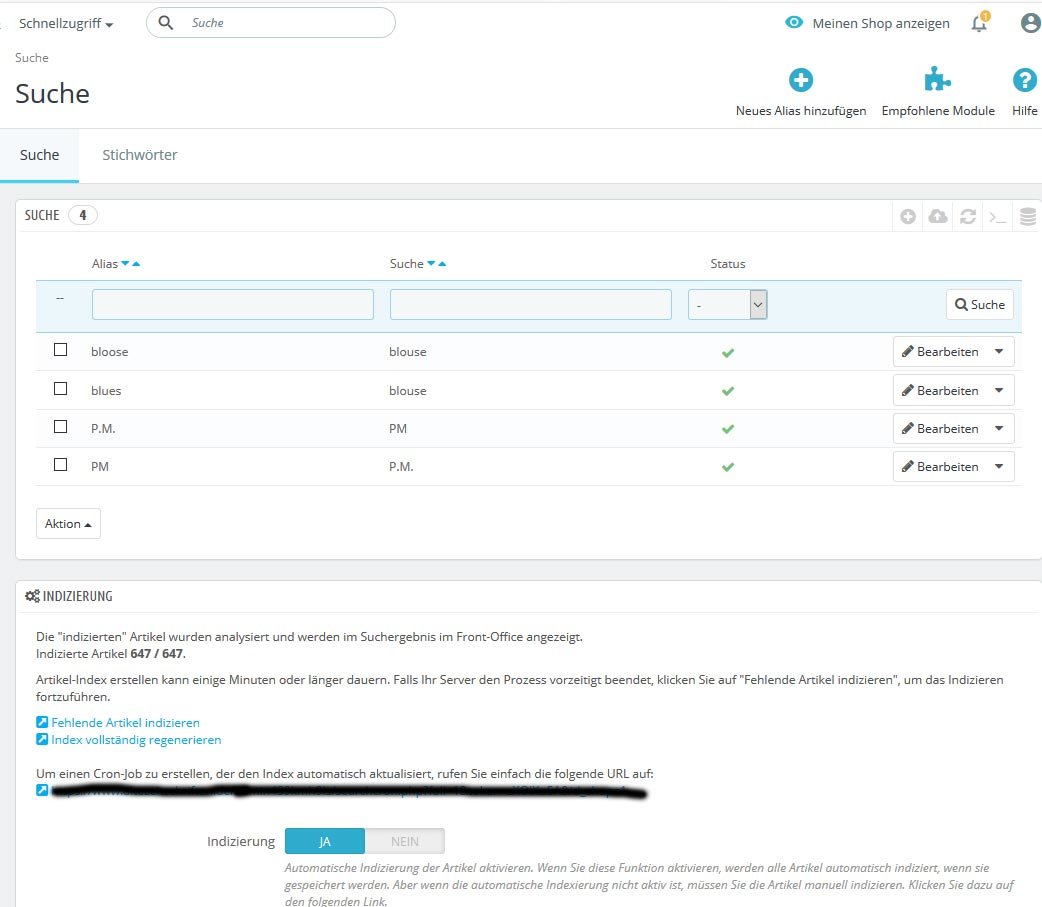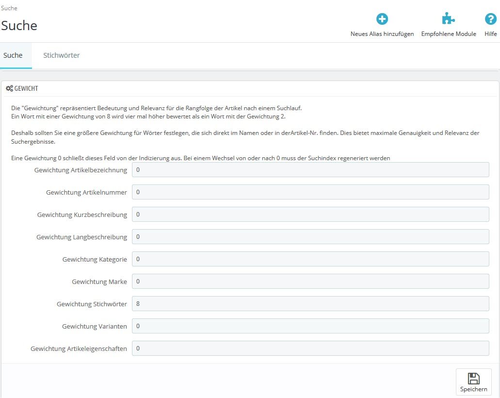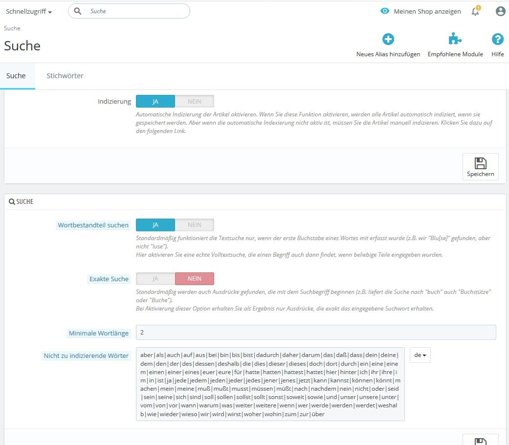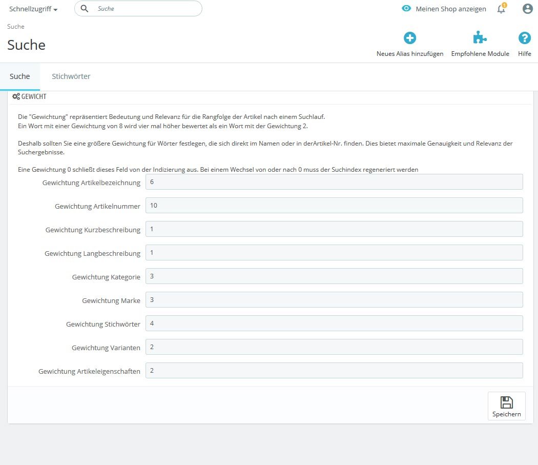 Ich habe auch unter Shop-Einstellungen > Suche > Alias eingeben. Und zwar wie folgt.